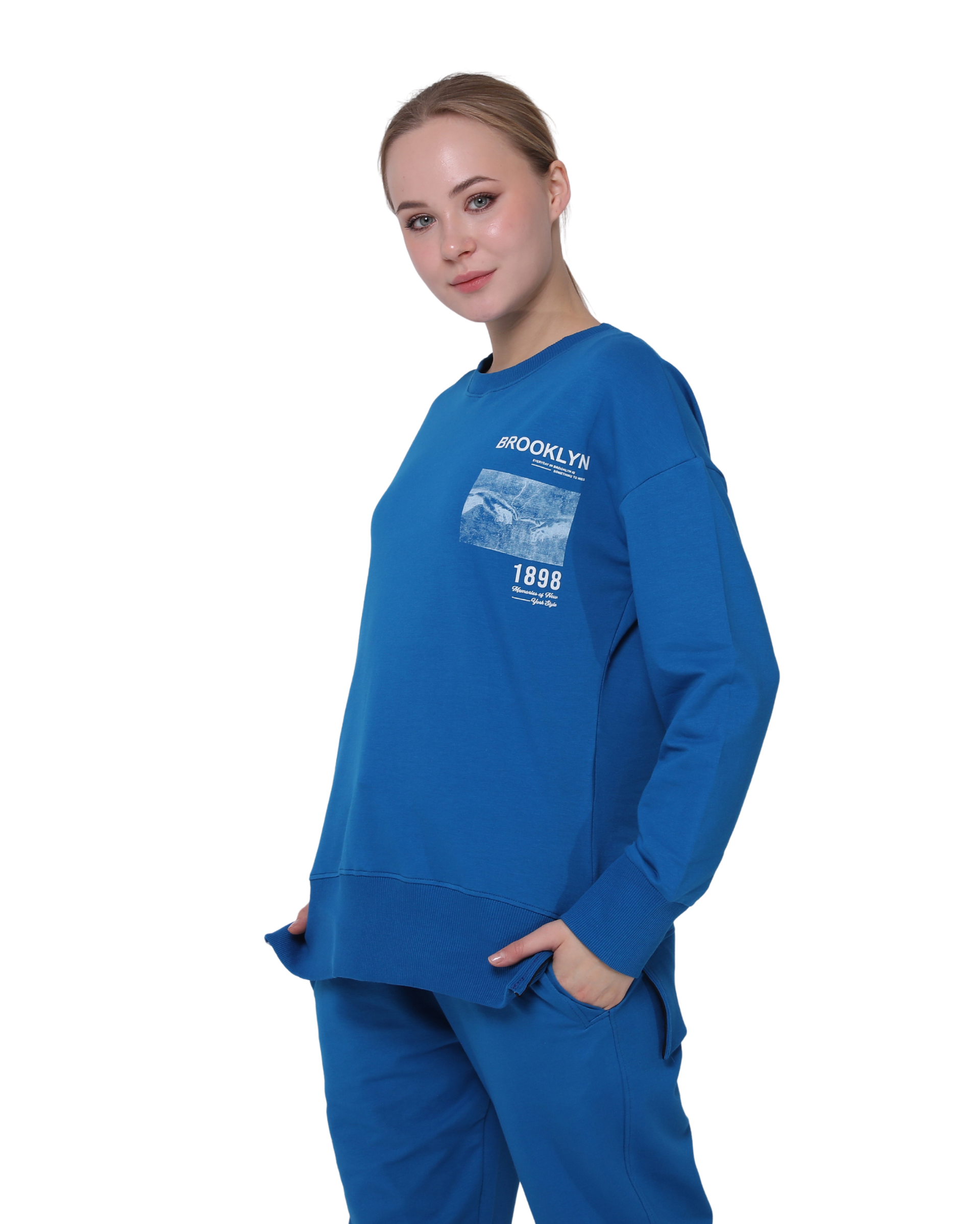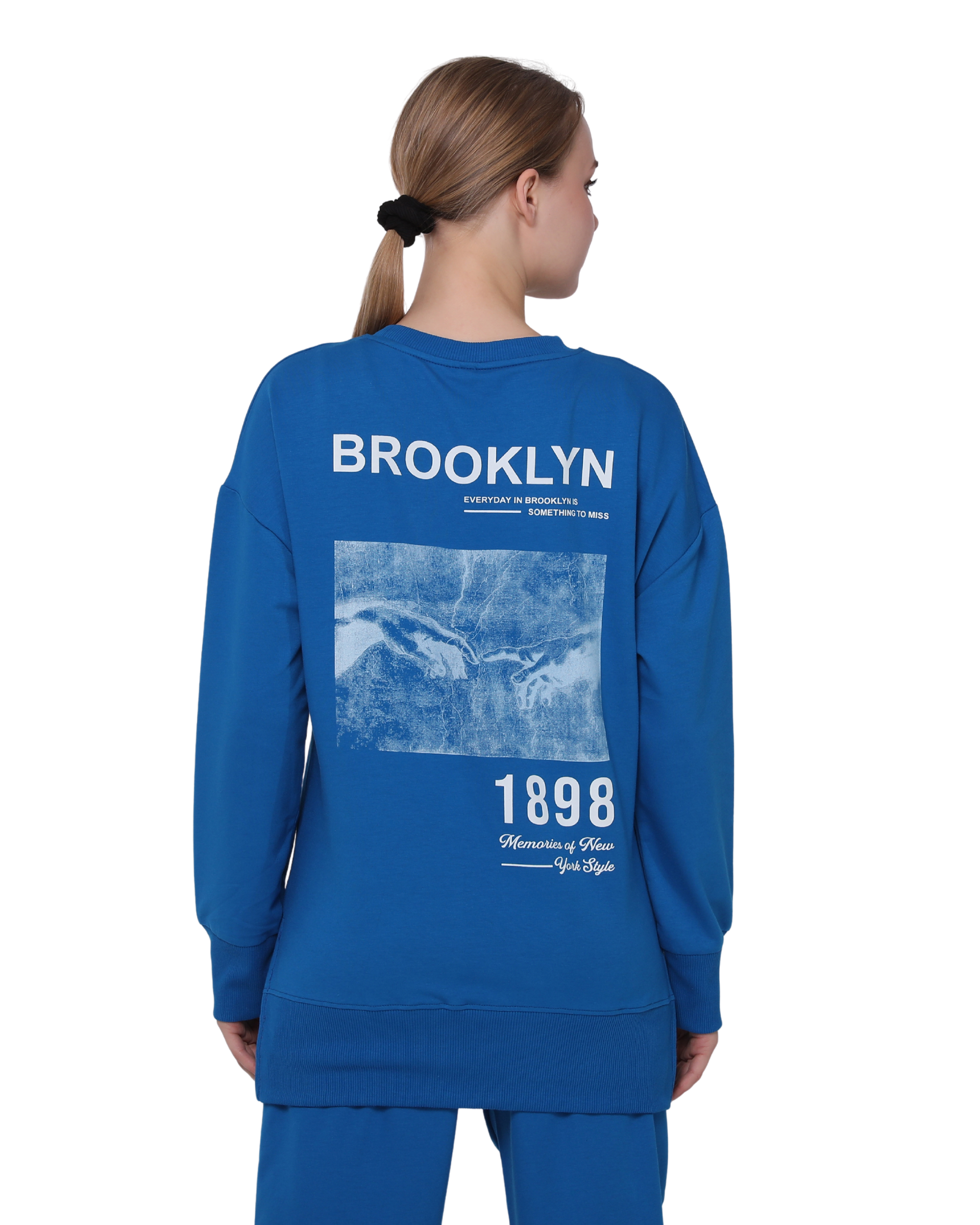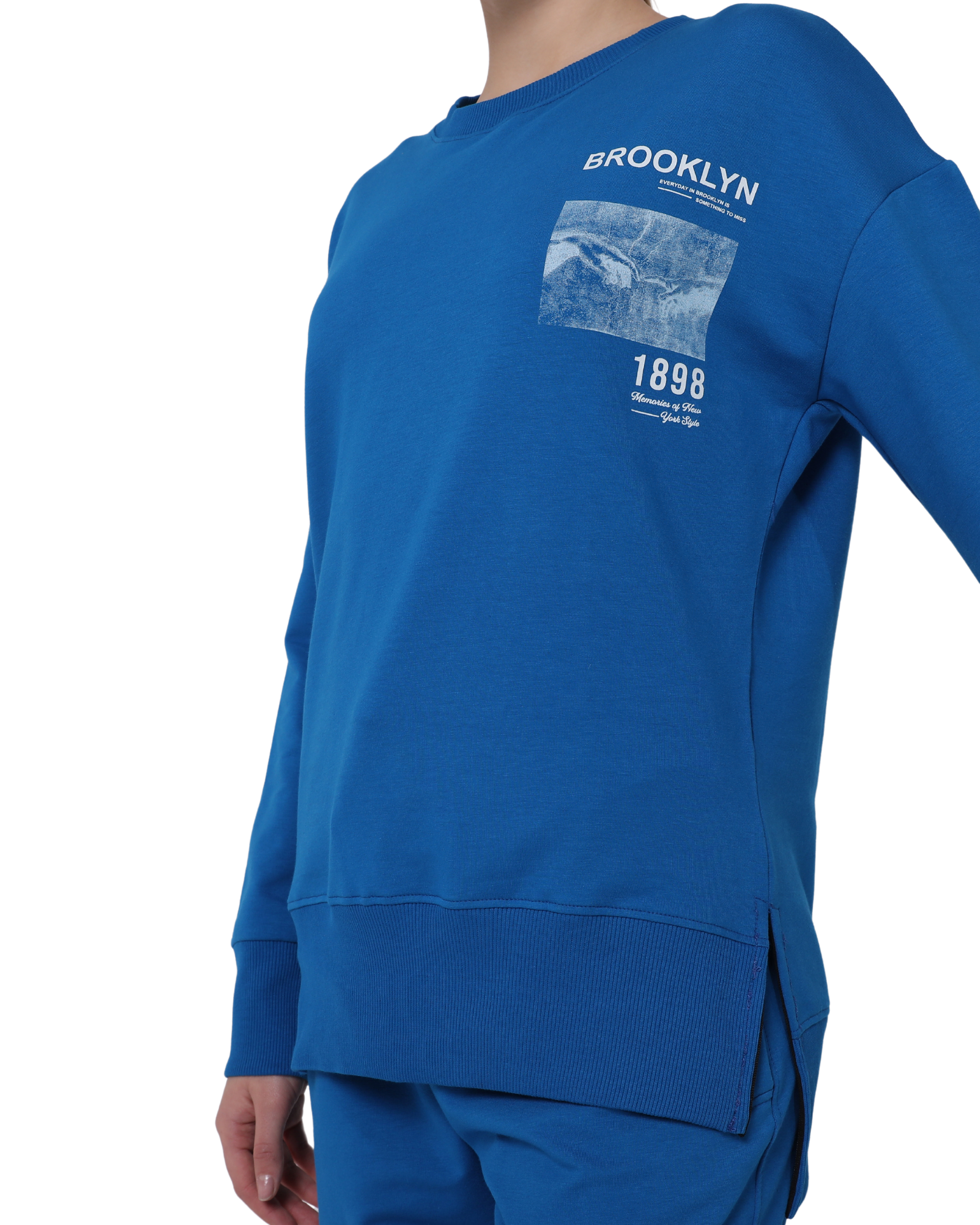 Brooklyn Print Oversize Slim Fit Crew Neck Sweatshirt with Side Slits, Royal Blue