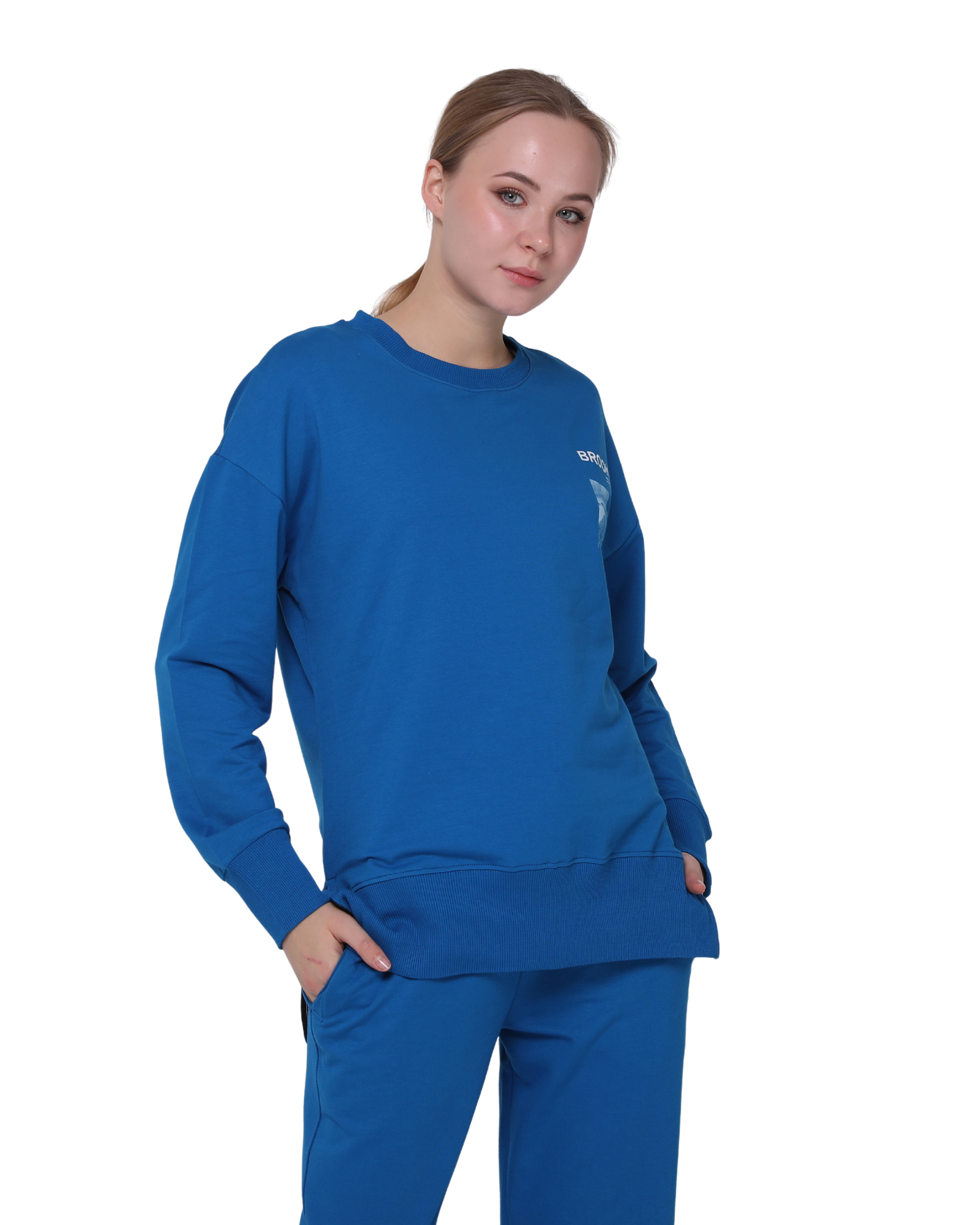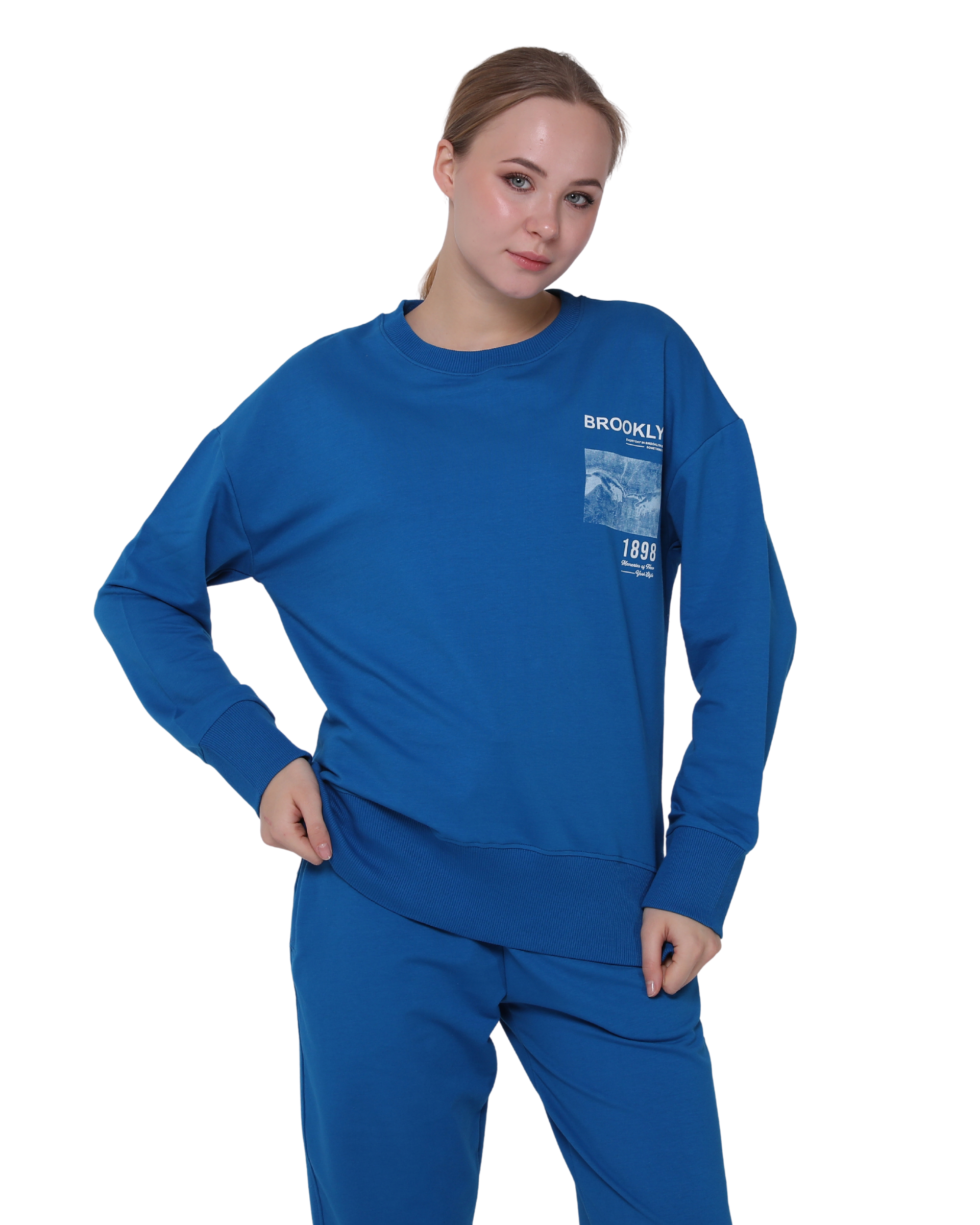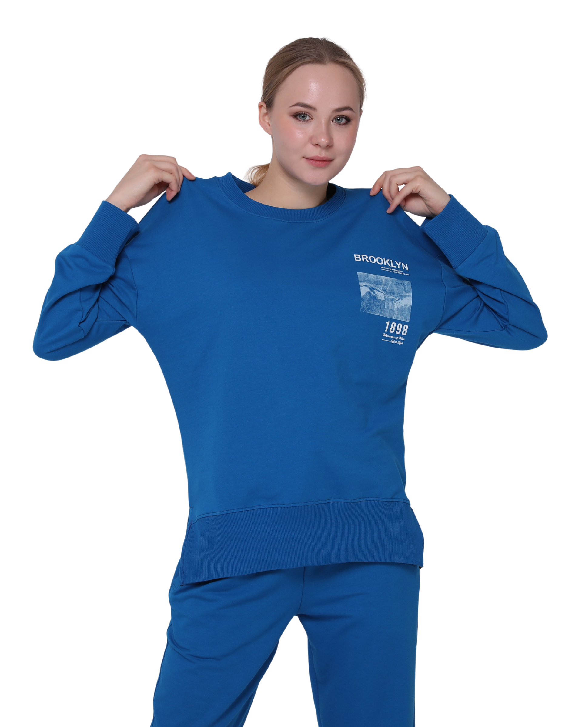 Brooklyn Print Oversize Slim Fit Crew Neck Sweatshirt with Side Slits, Royal Blue