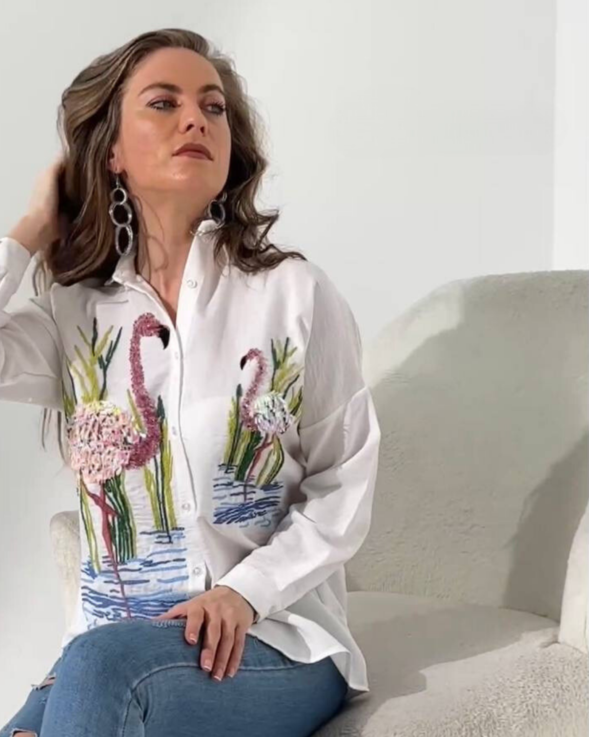 Marka Best Flamingo Embroidered Basic Linen Shirt White