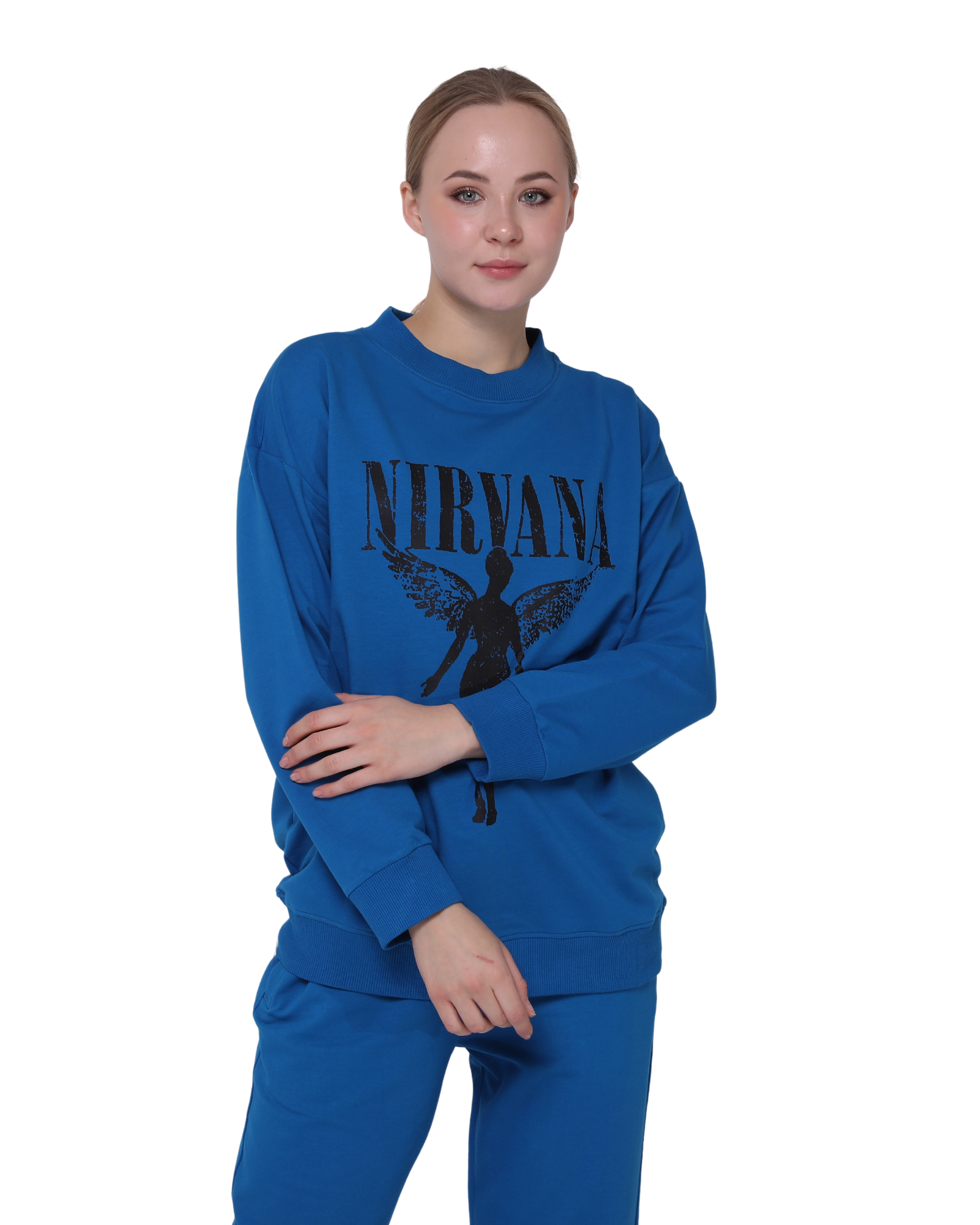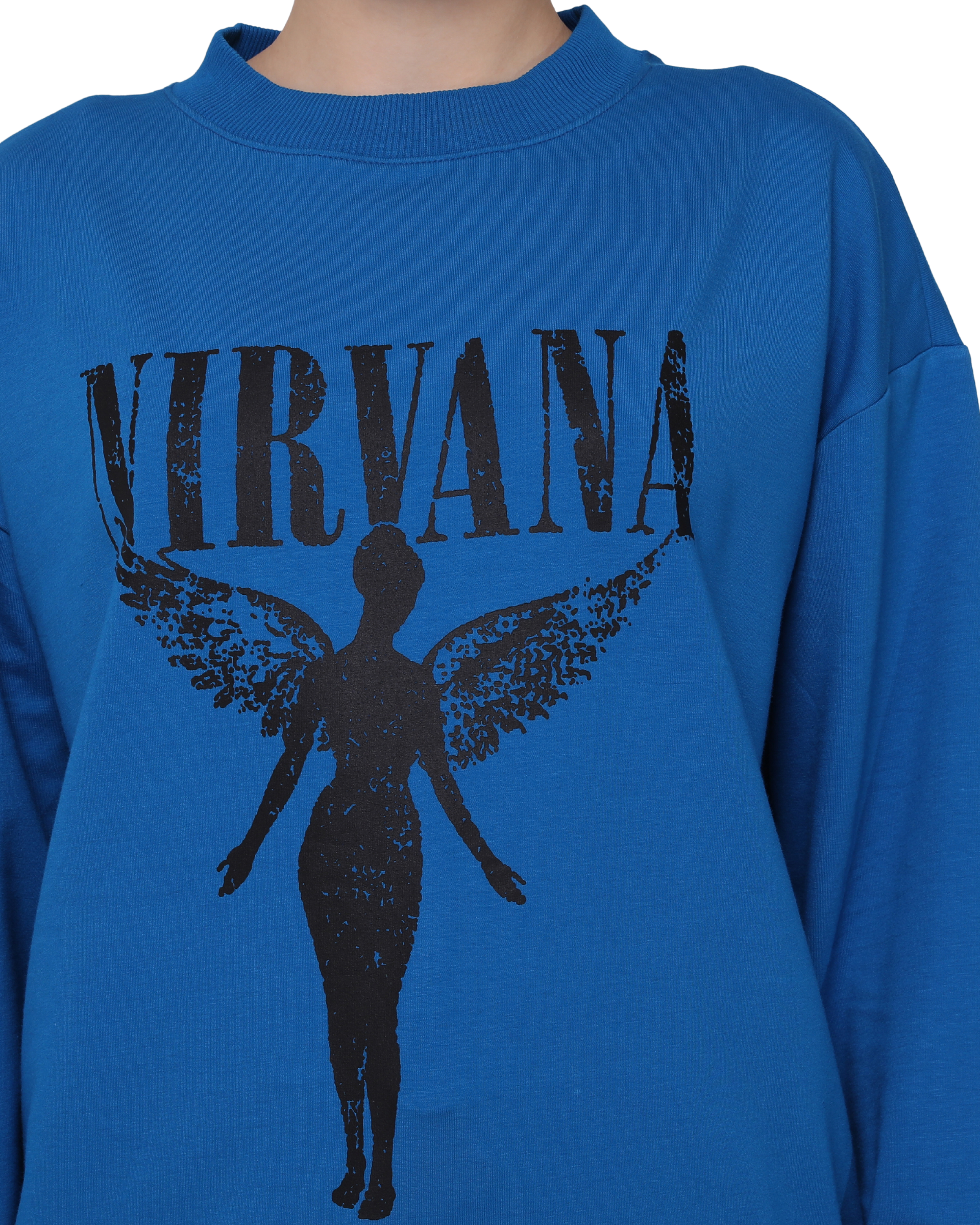 Nirvana Print Oversize Slim Fit Crew Neck Sweatshirt Navy Blue