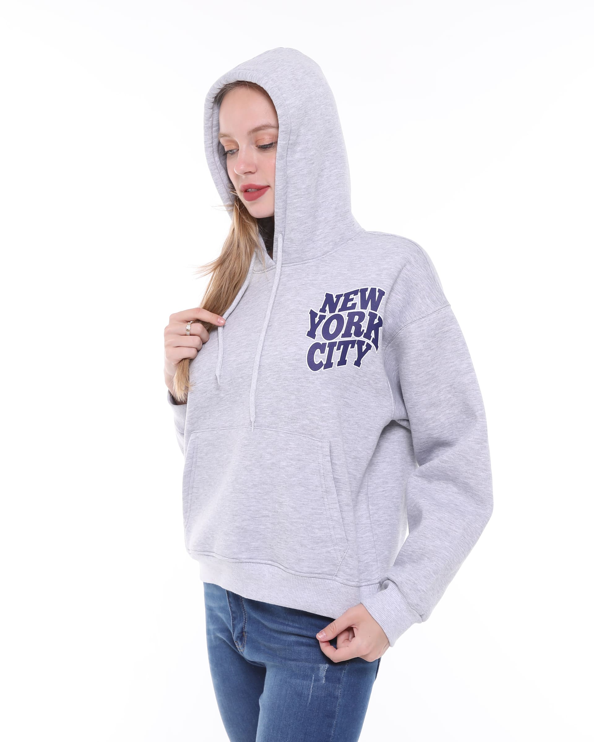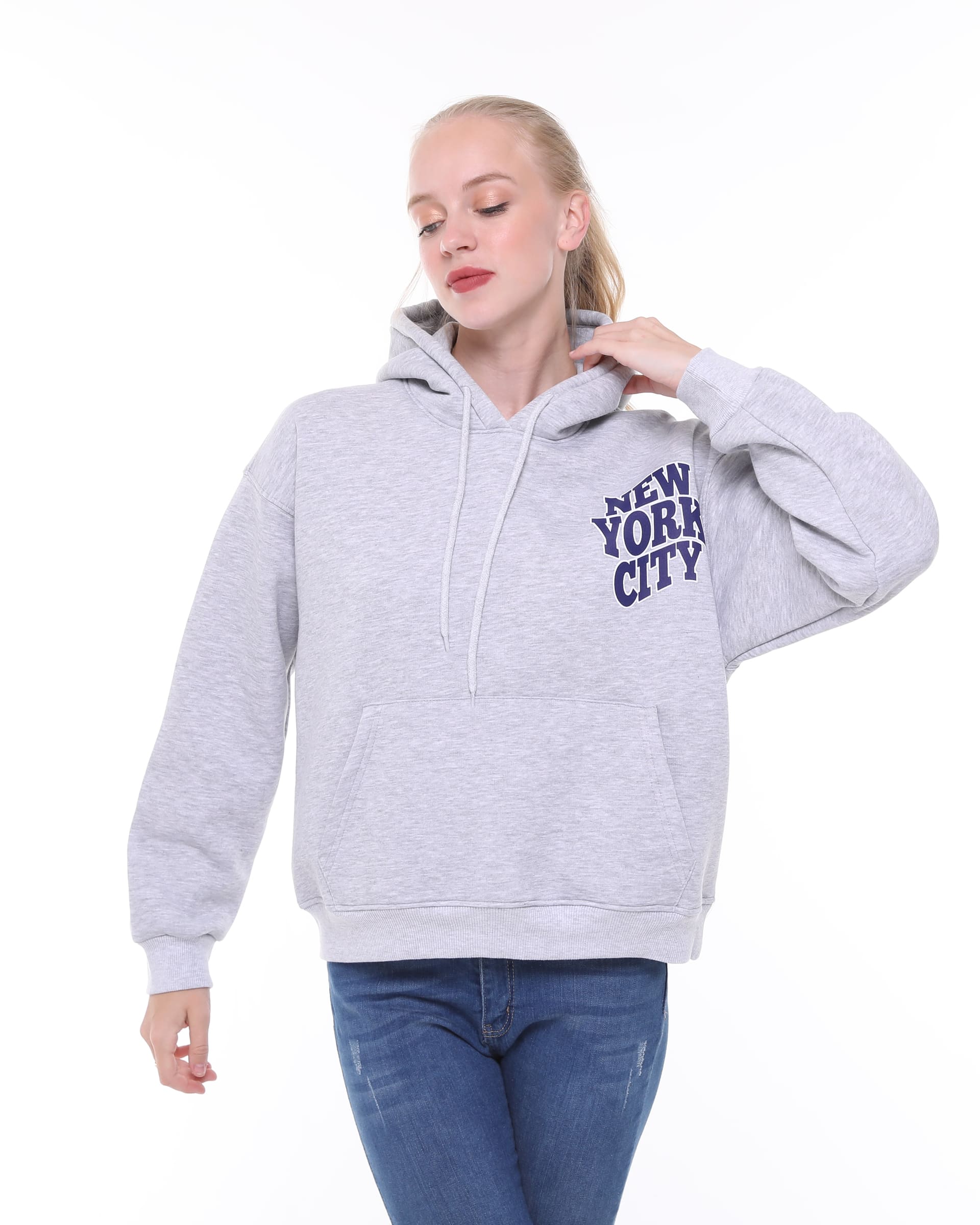 The New York City Detailed Hooded Oversize Sweatshirt is an oversized hooded top made from soft, fleece-lined sweatshirt fabric, featuring a New York City print on the front and back. This high-quality sweatshirt boasts a double-layered wrap hood, dropped shoulders, long sleeves, a kangaroo pocket, and ribbed cuffs and hem.