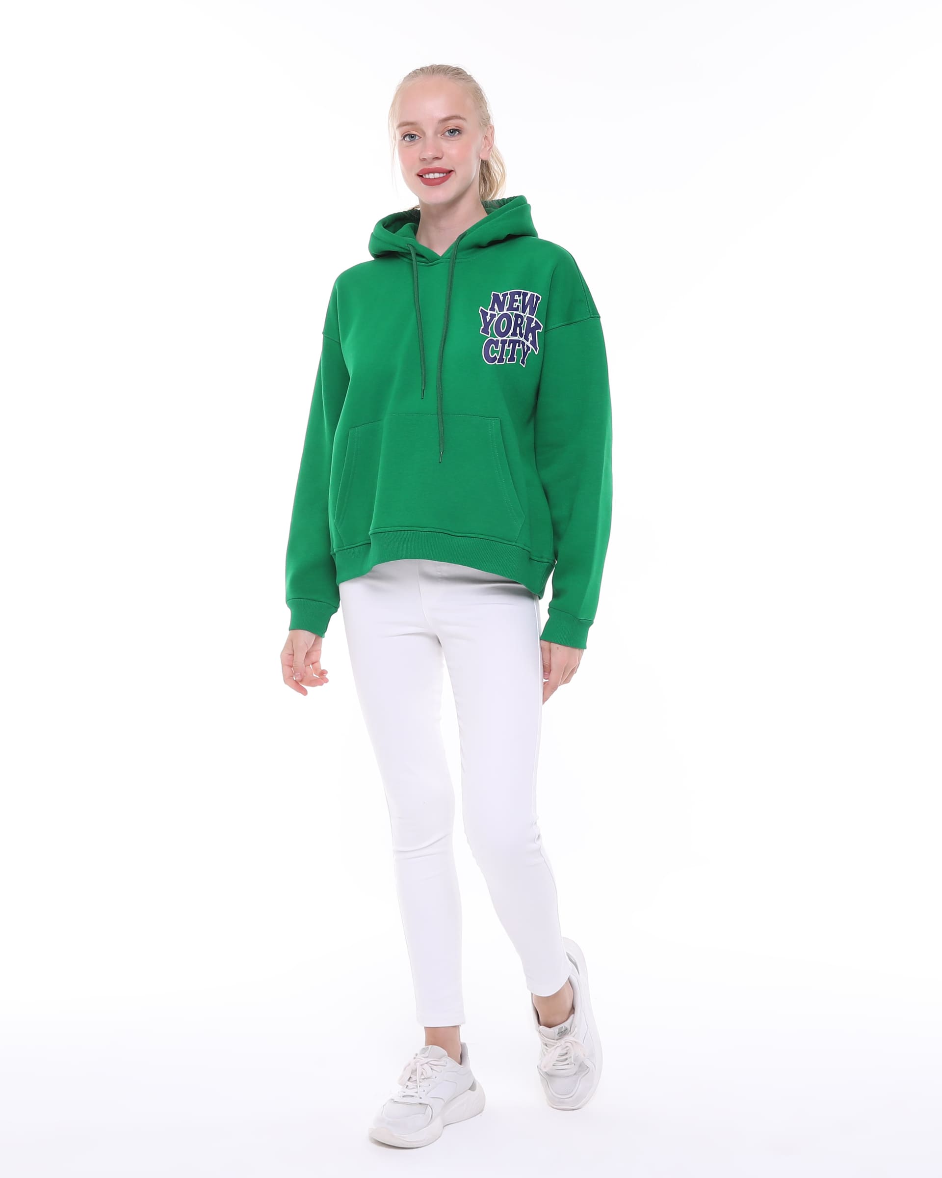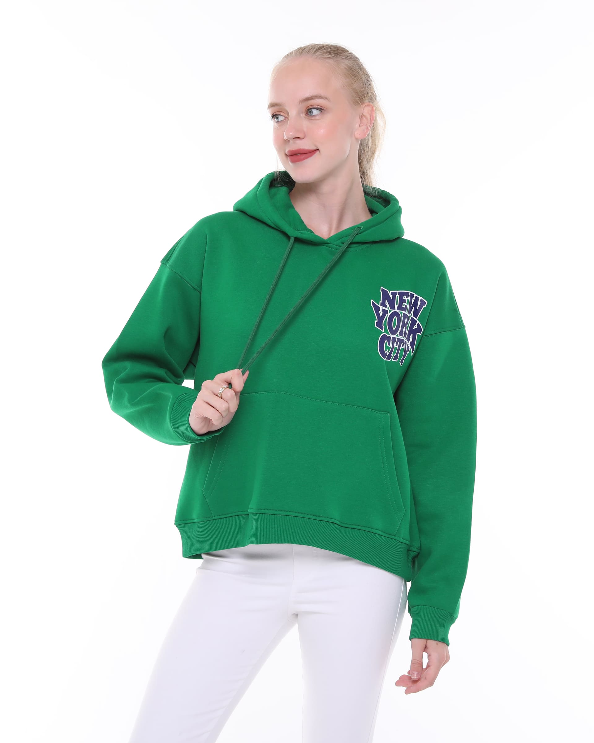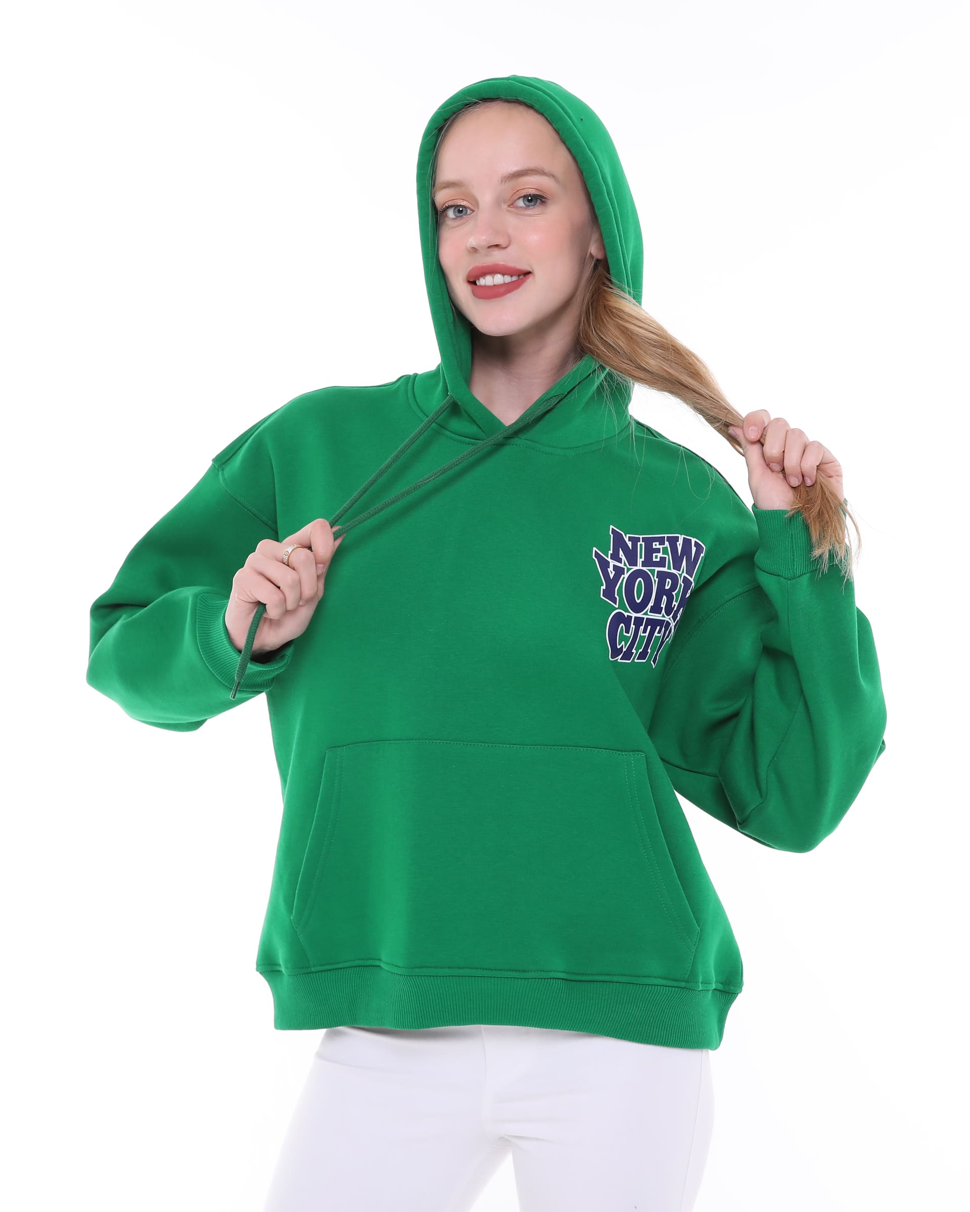 The New York City Detailed Hooded Oversize Sweatshirt is an oversized hooded top made from soft, fleece-lined sweatshirt fabric, featuring a New York City print on the front and back. This high-quality sweatshirt boasts a double-layered wrap hood, dropped shoulders, long sleeves, a kangaroo pocket, and ribbed cuffs and hem.