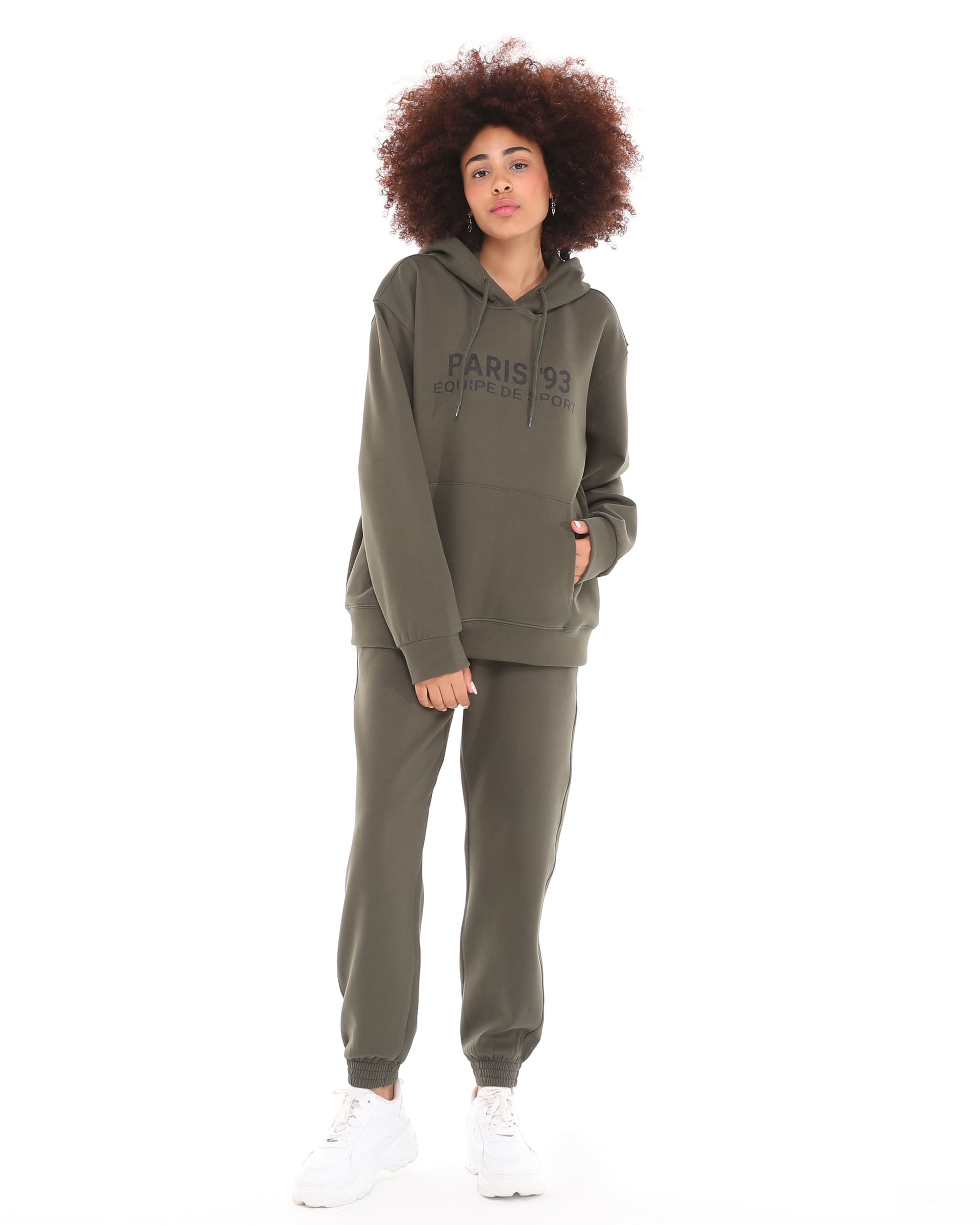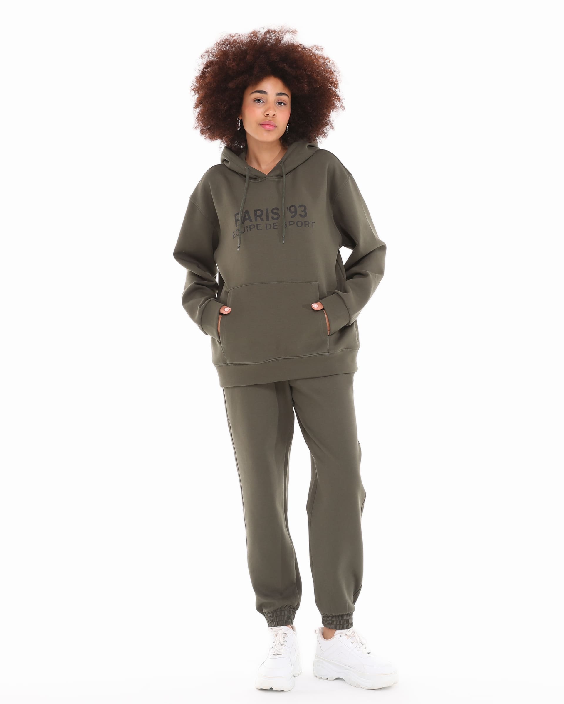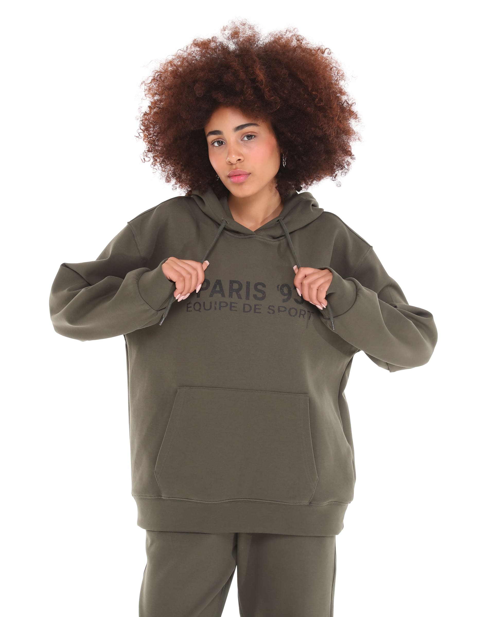 Paris 93 Detailed Oversize Hooded Khaki Sweatshirt