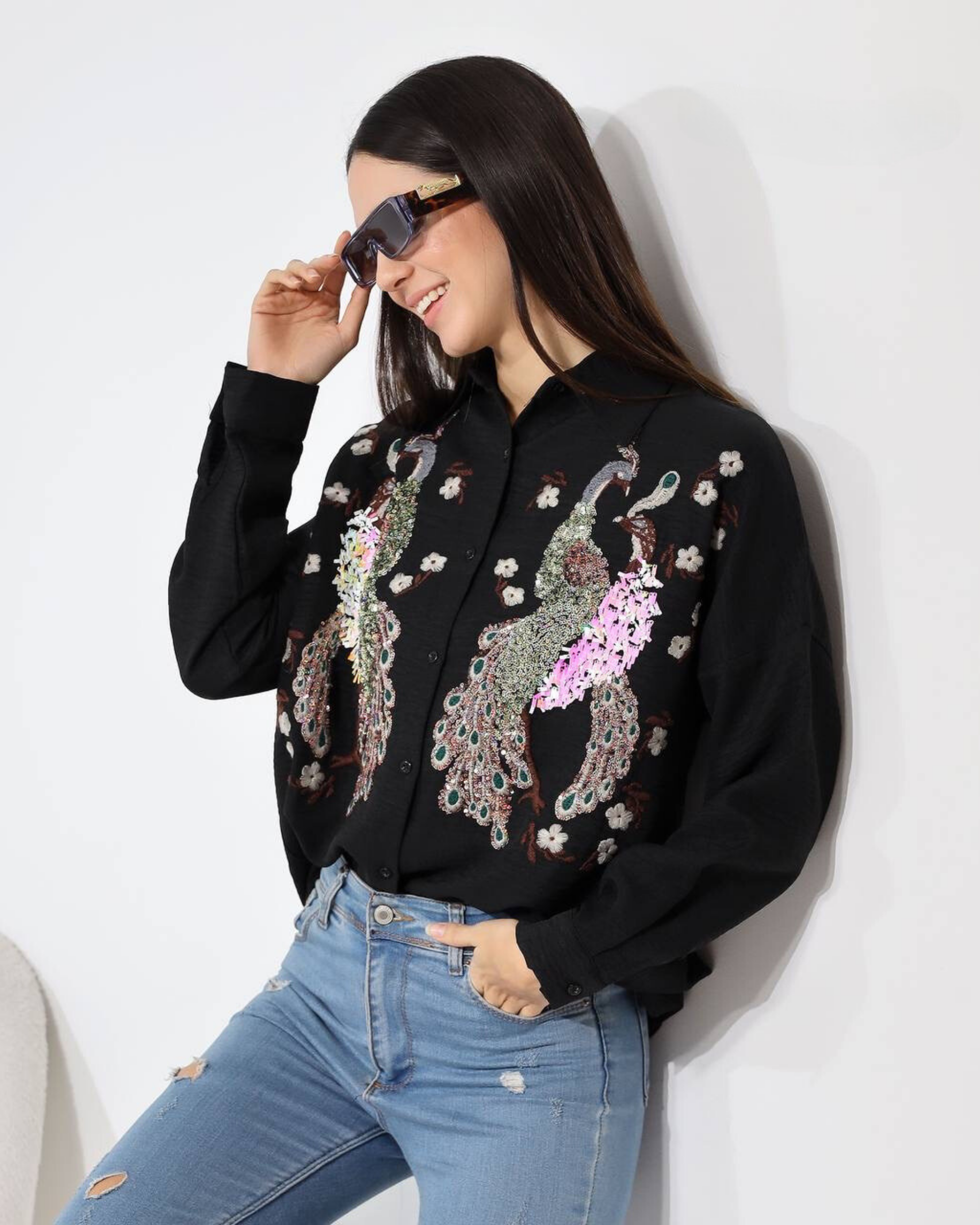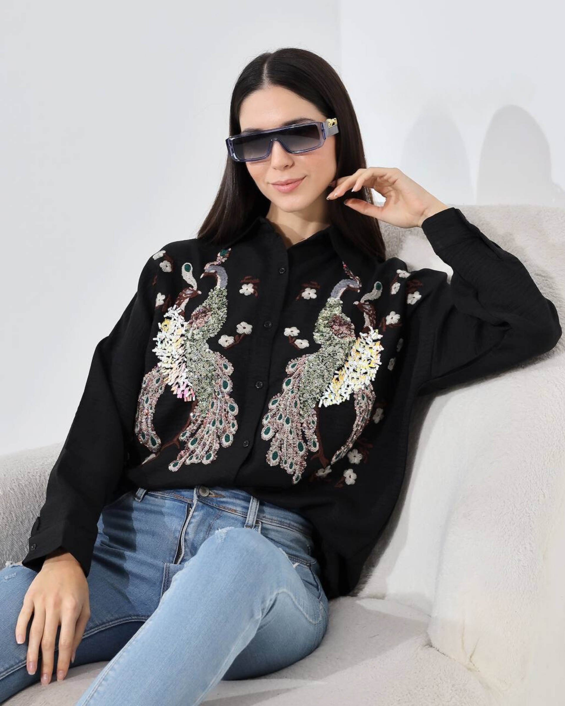 Marka Best Peacock Embroidered Basic Linen Shirt Black