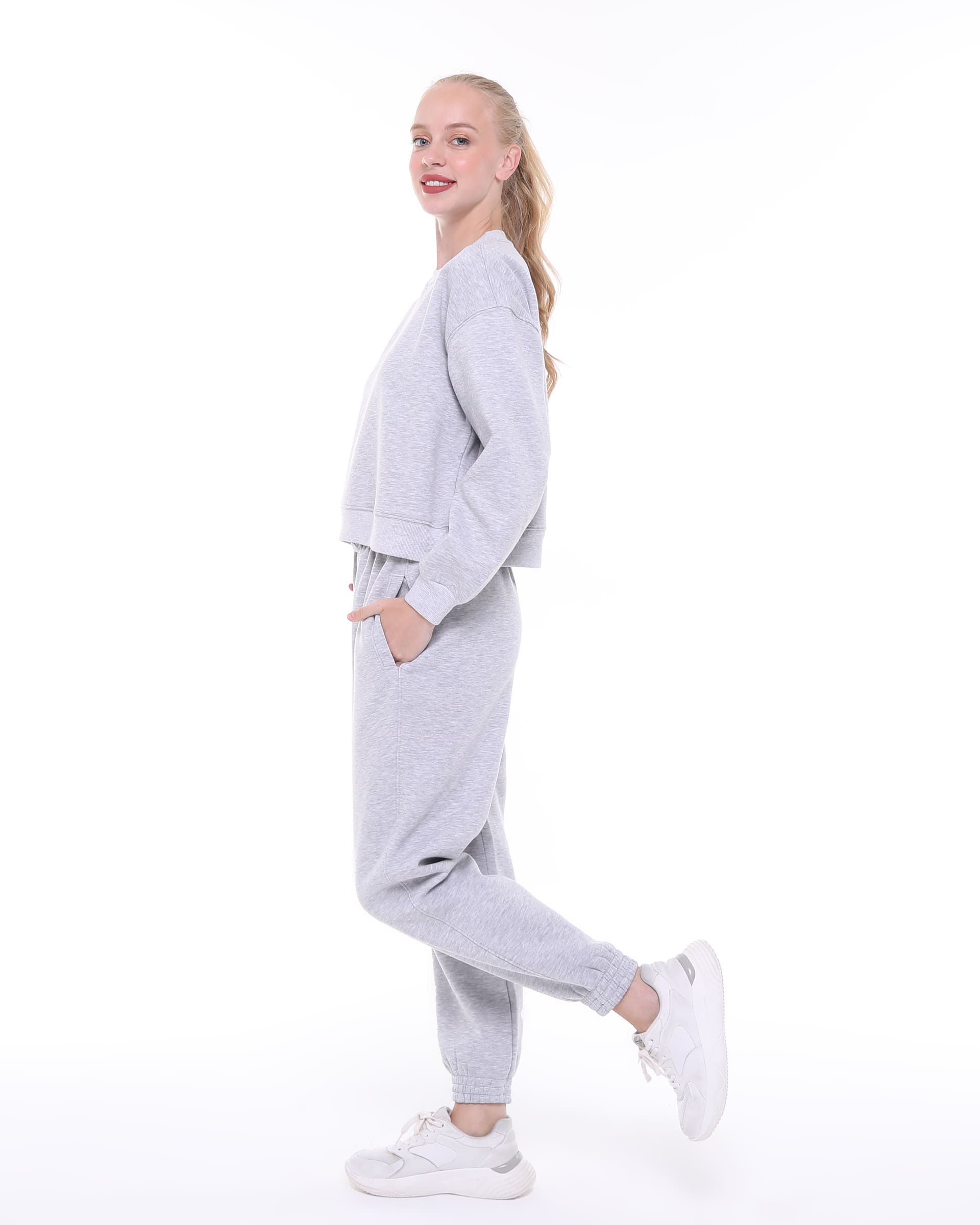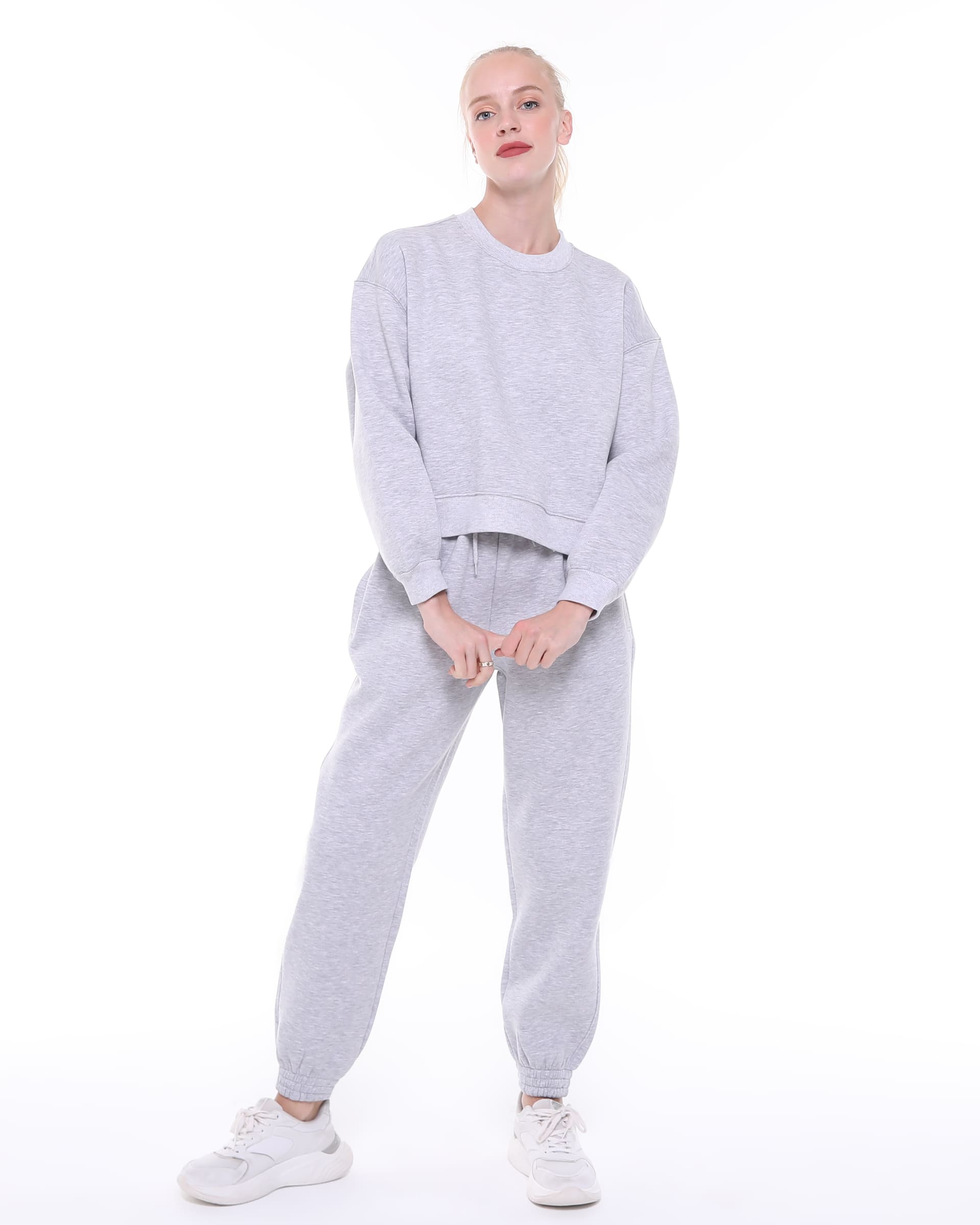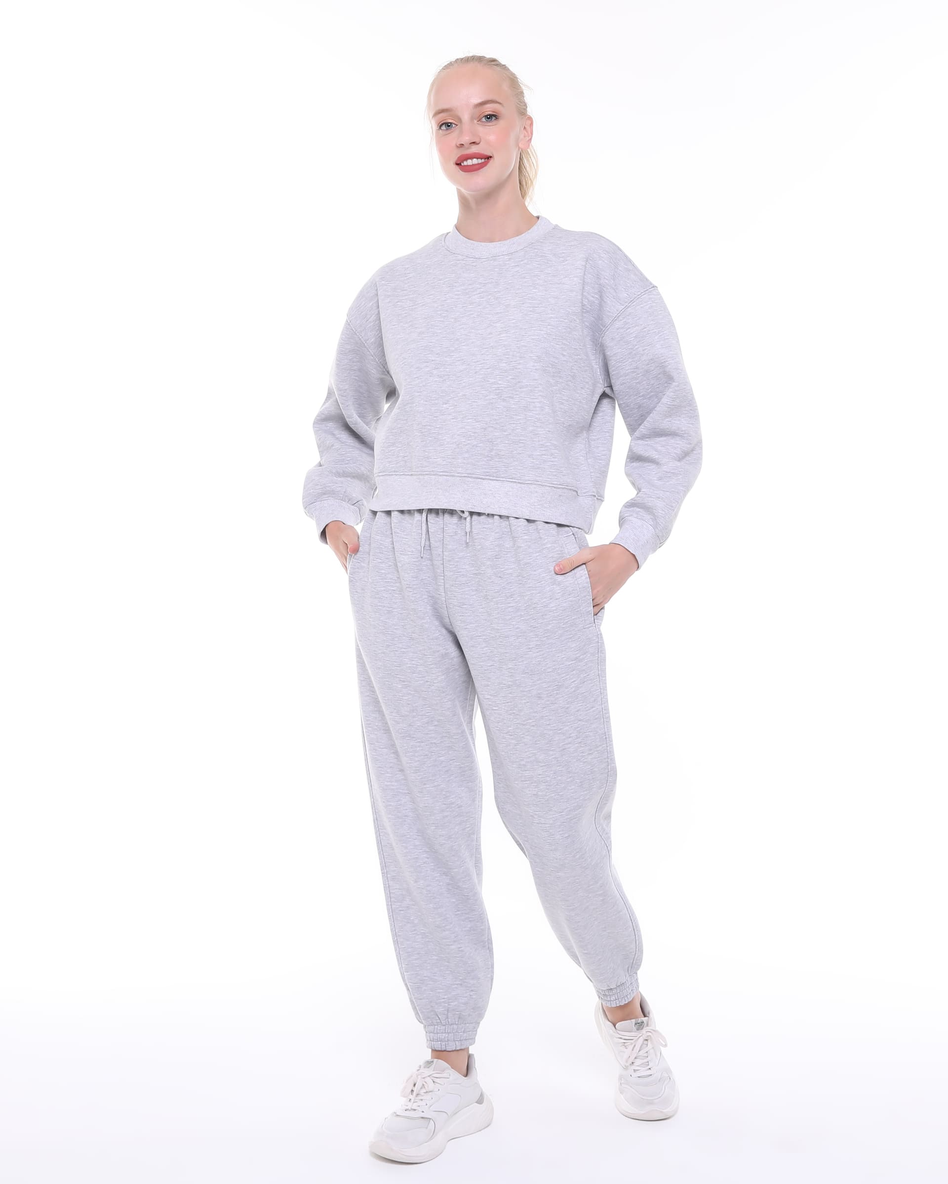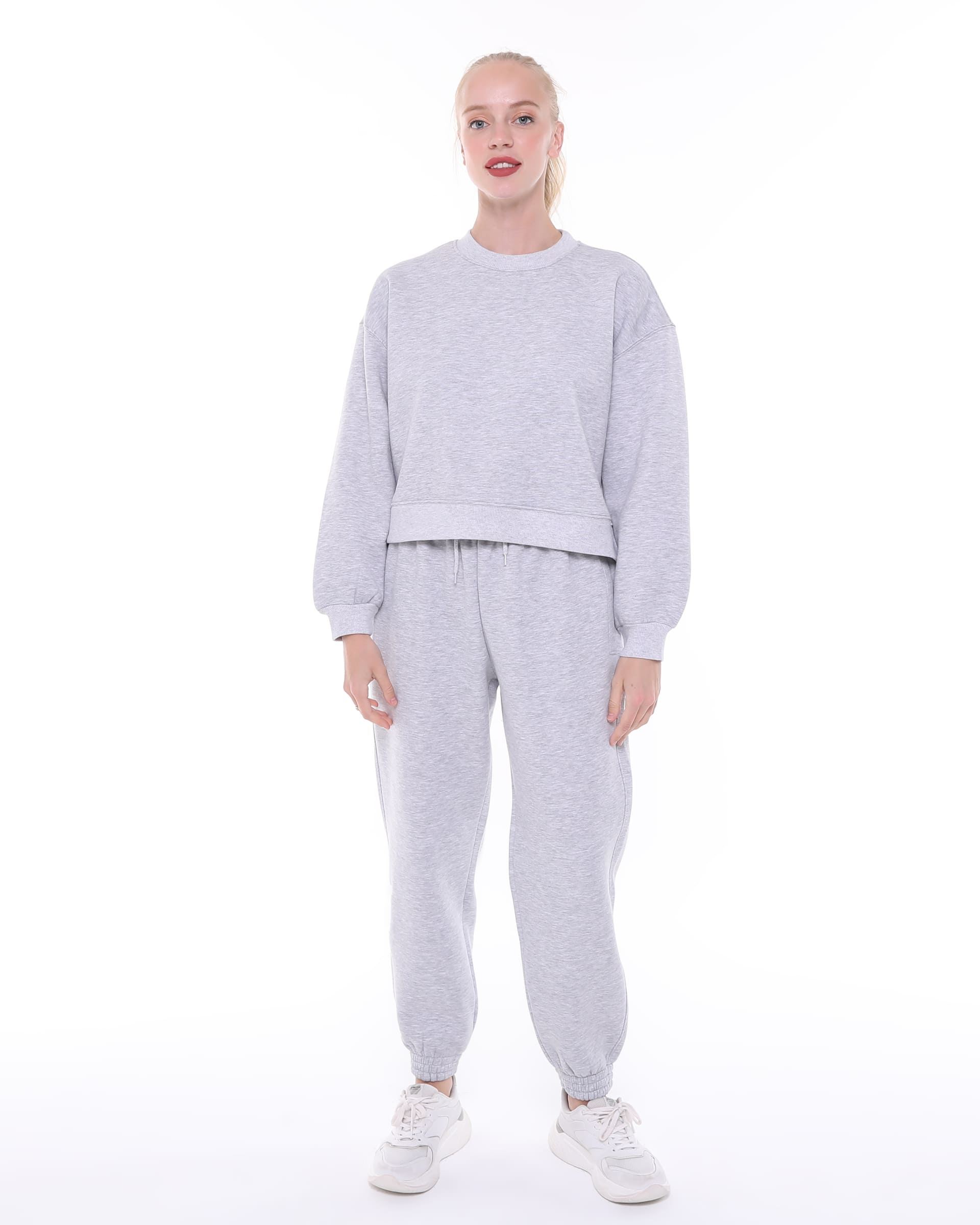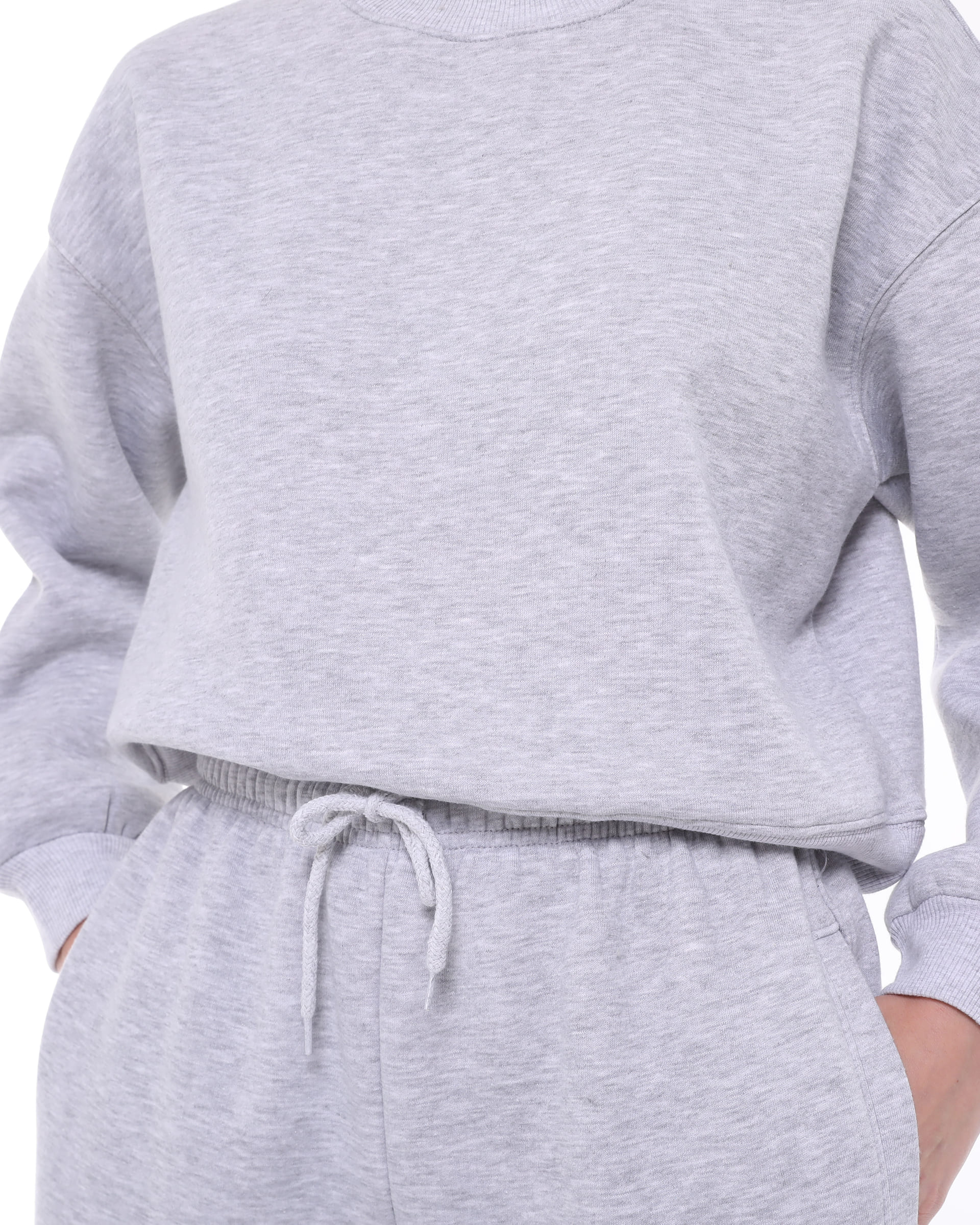The Short Crew Neck Smoke Grey Sweatshirt is an oversized top with a crew neck, made from soft, fleece-lined sweatshirt fabric. This high-quality sweatshirt features dropped shoulders, long sleeves, and ribbed cuffs and hem.