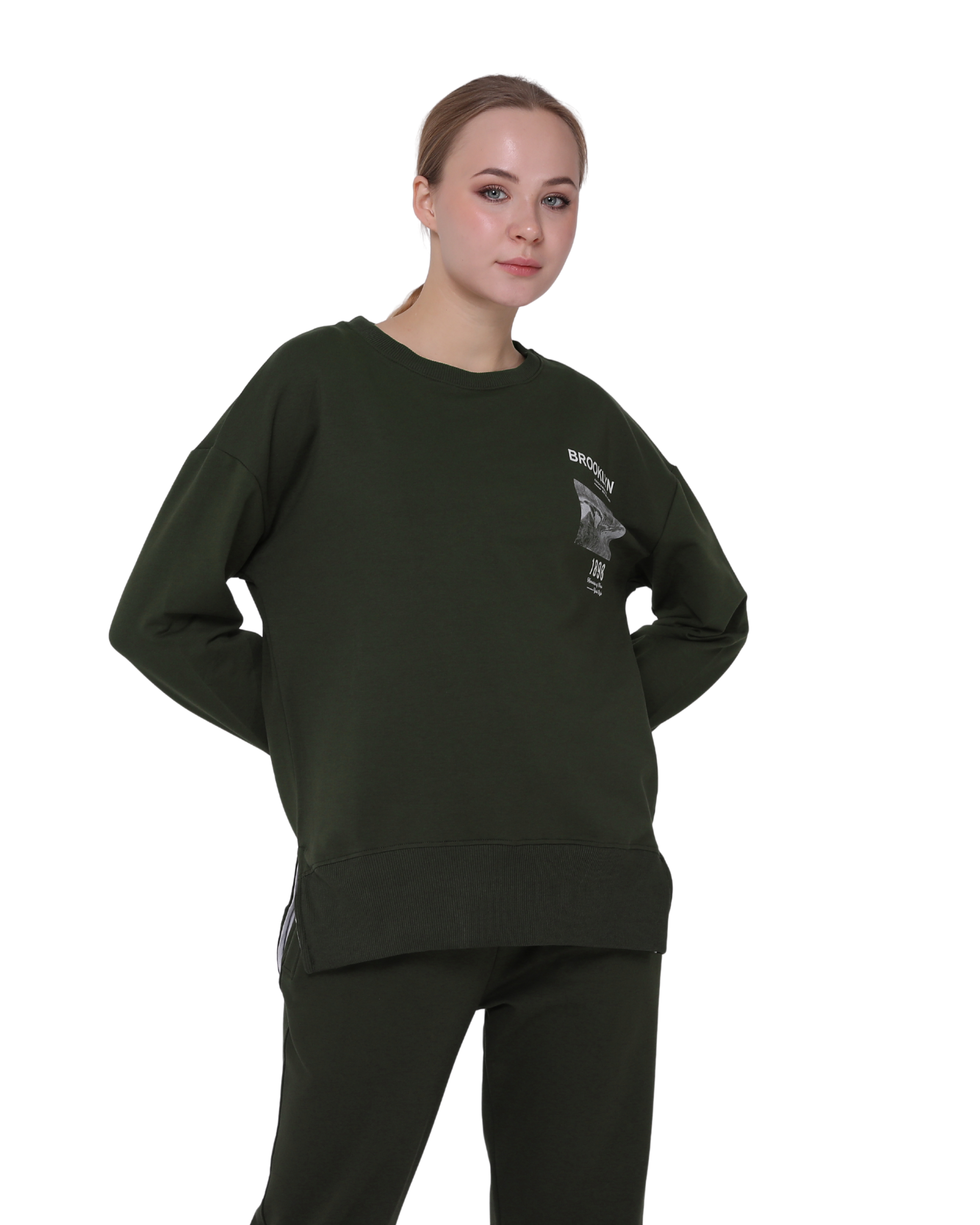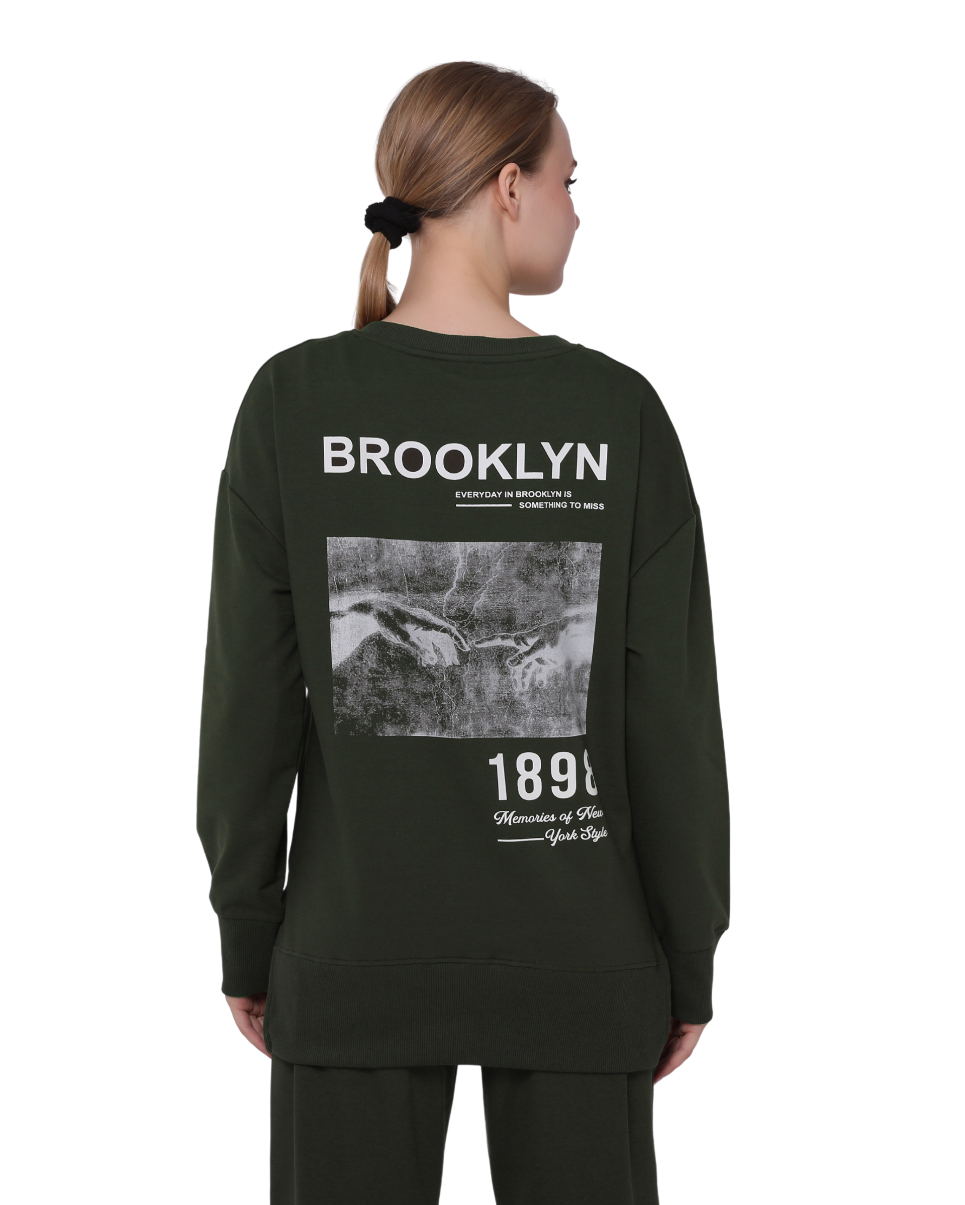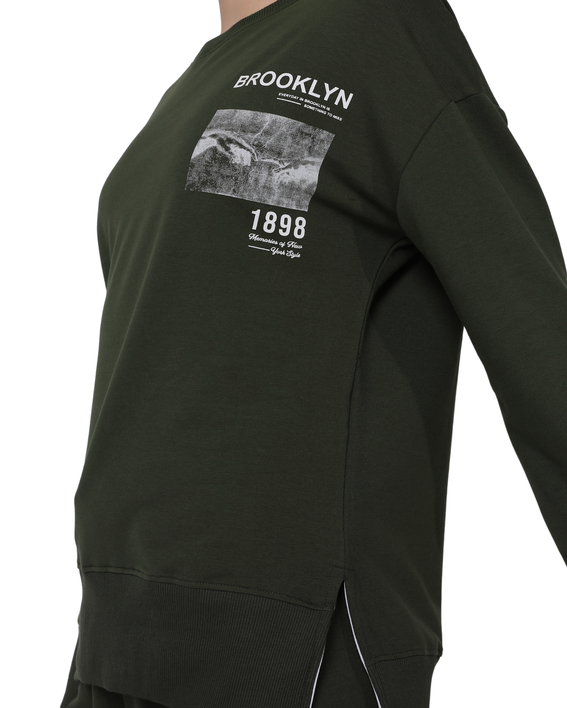 Brooklyn Print Oversize Slim Fit Crew Neck Sweatshirt with Side Slits, Khaki Green