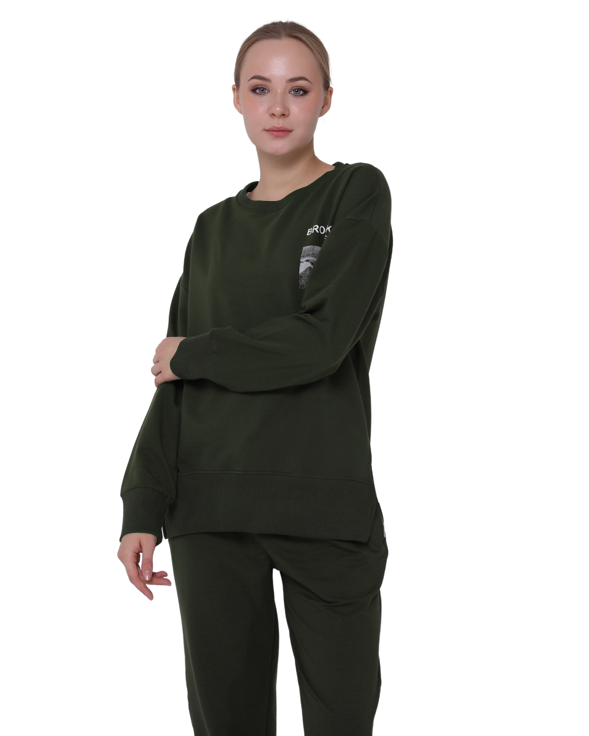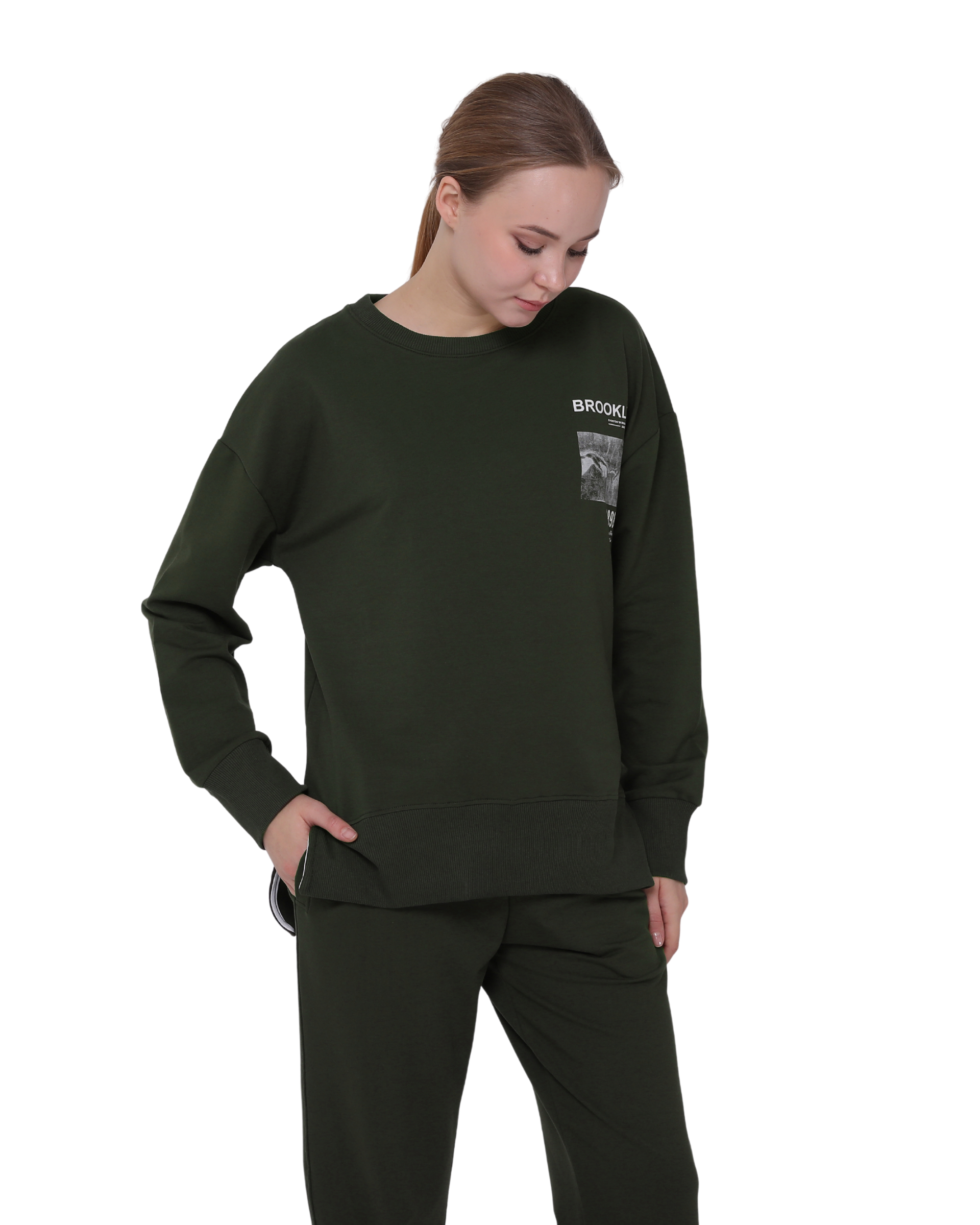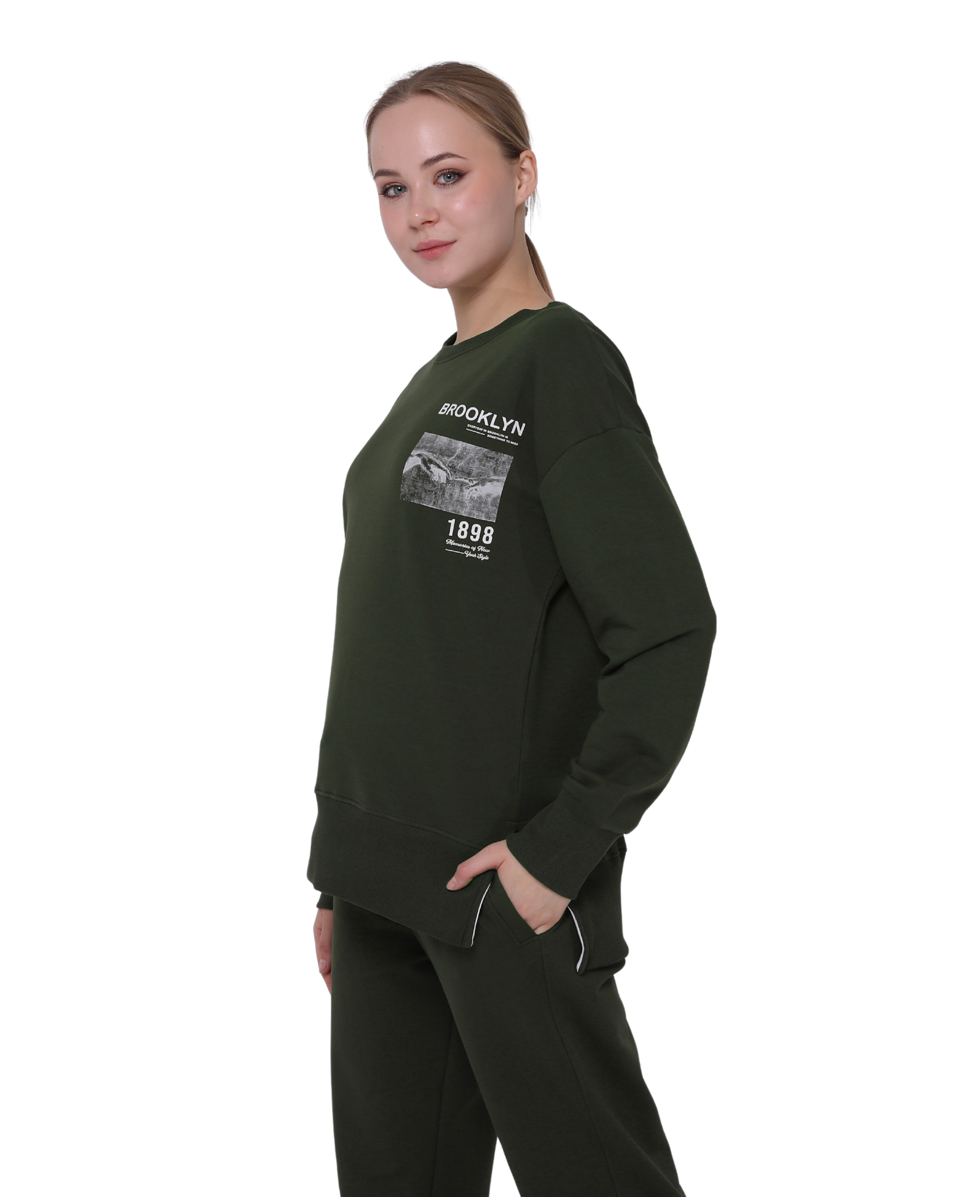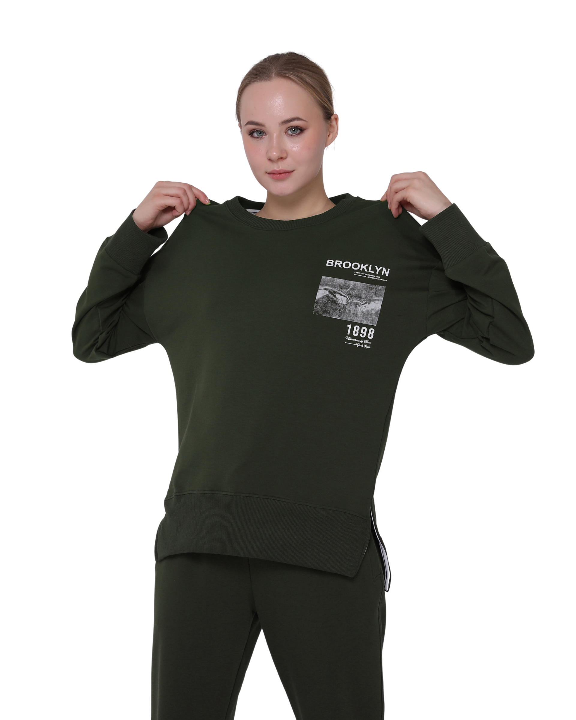 Brooklyn Print Oversize Slim Fit Crew Neck Sweatshirt with Side Slits, Khaki Green