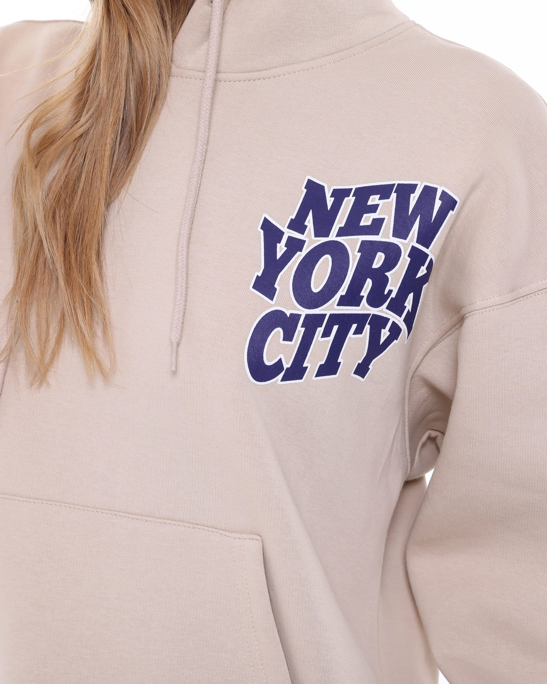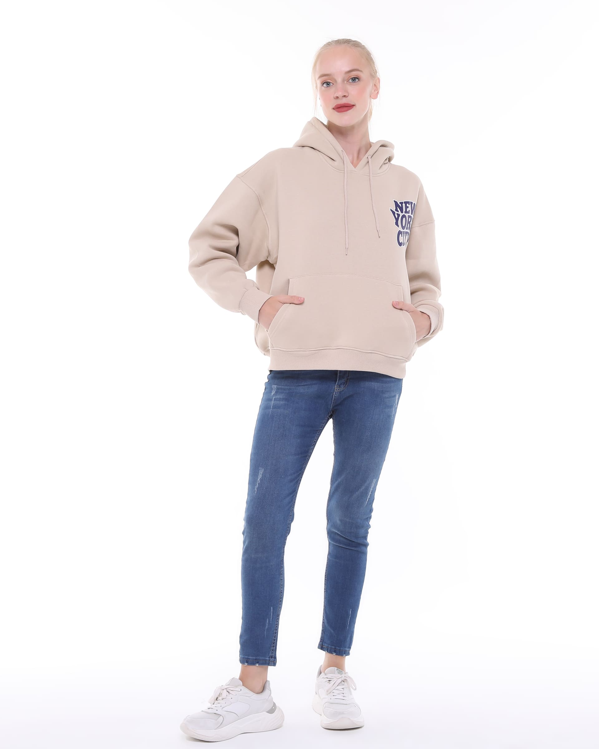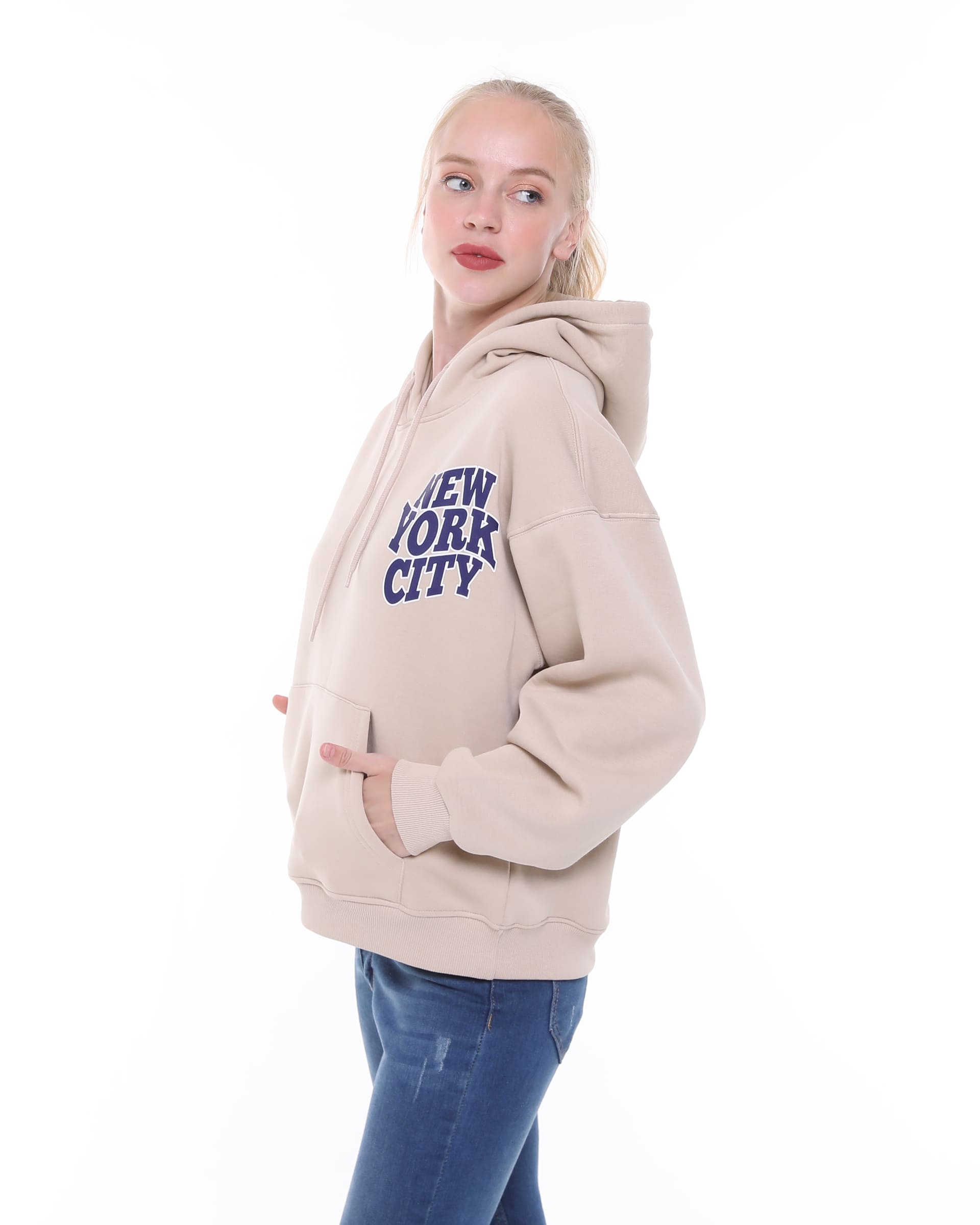 New York City Detailed and Hooded Oversize Beige Sweatshirt