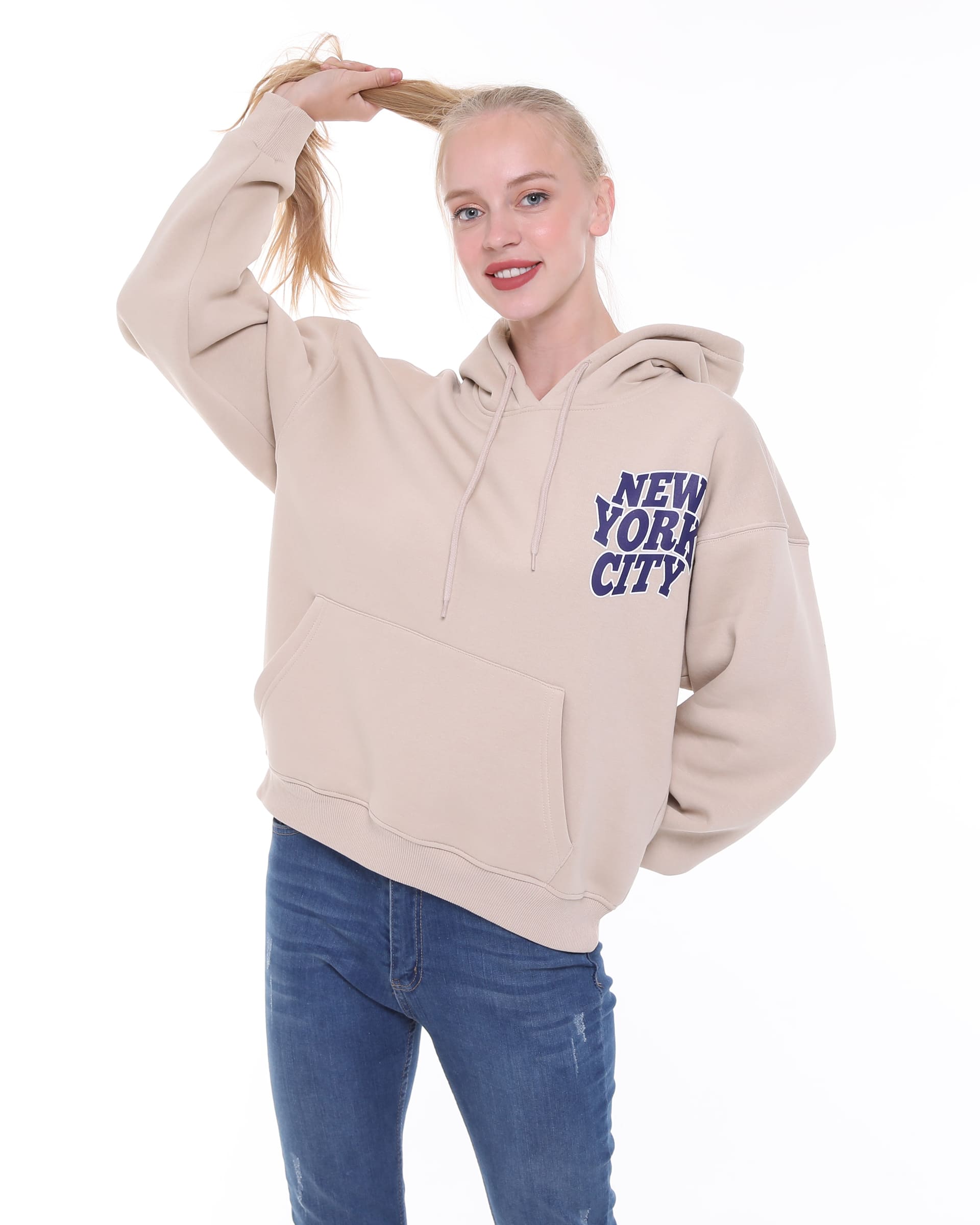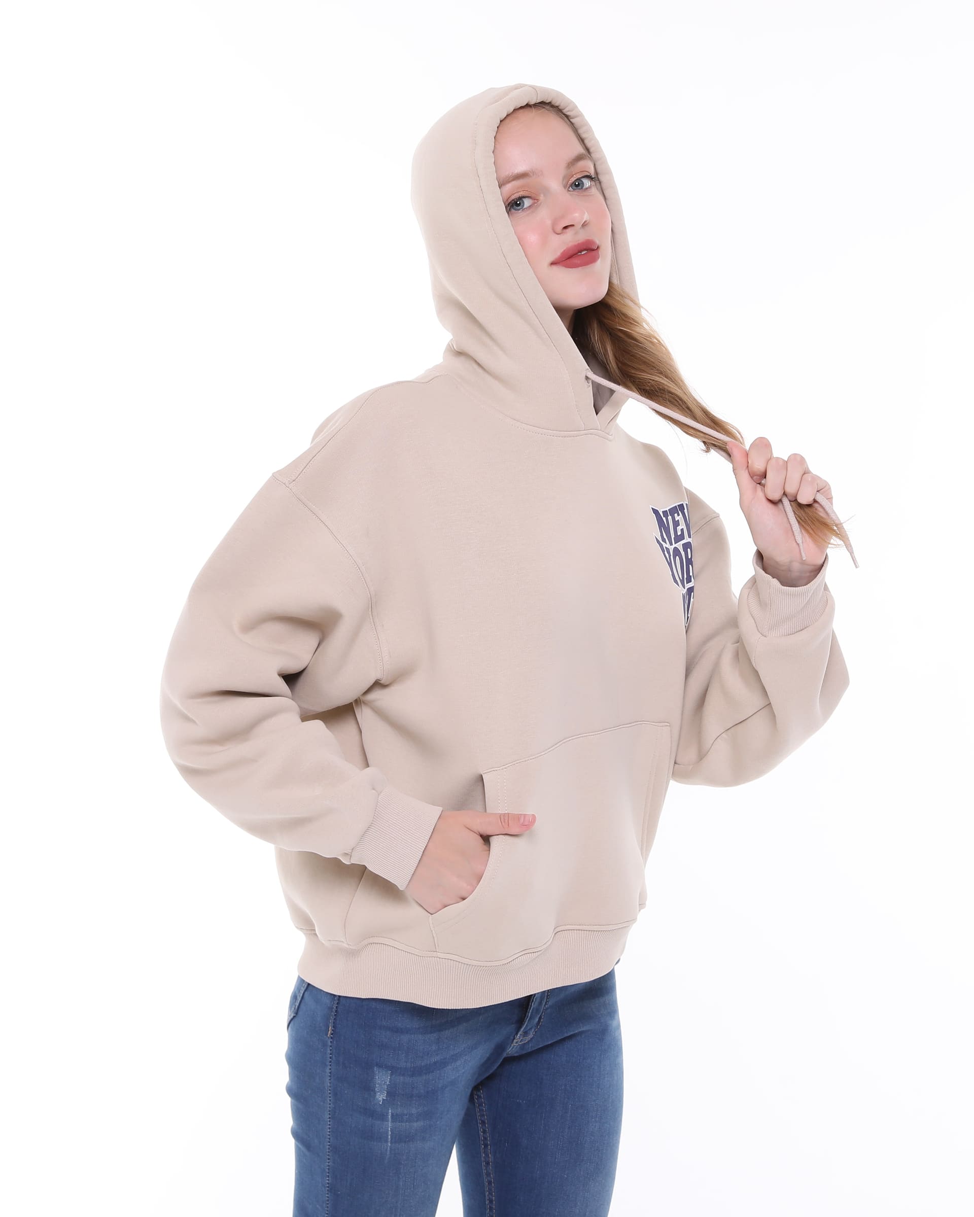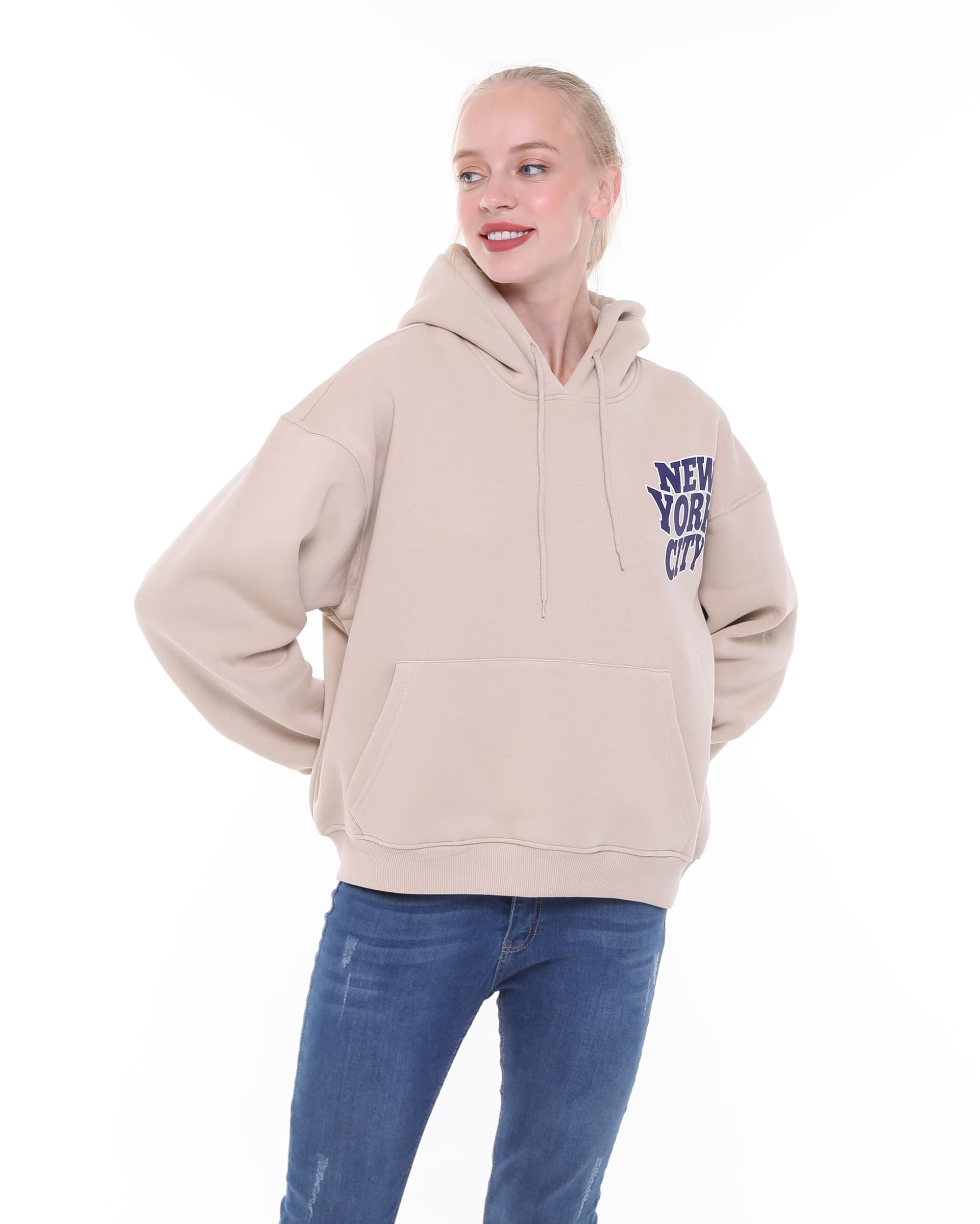 New York City Detailed and Hooded Oversize Beige Sweatshirt