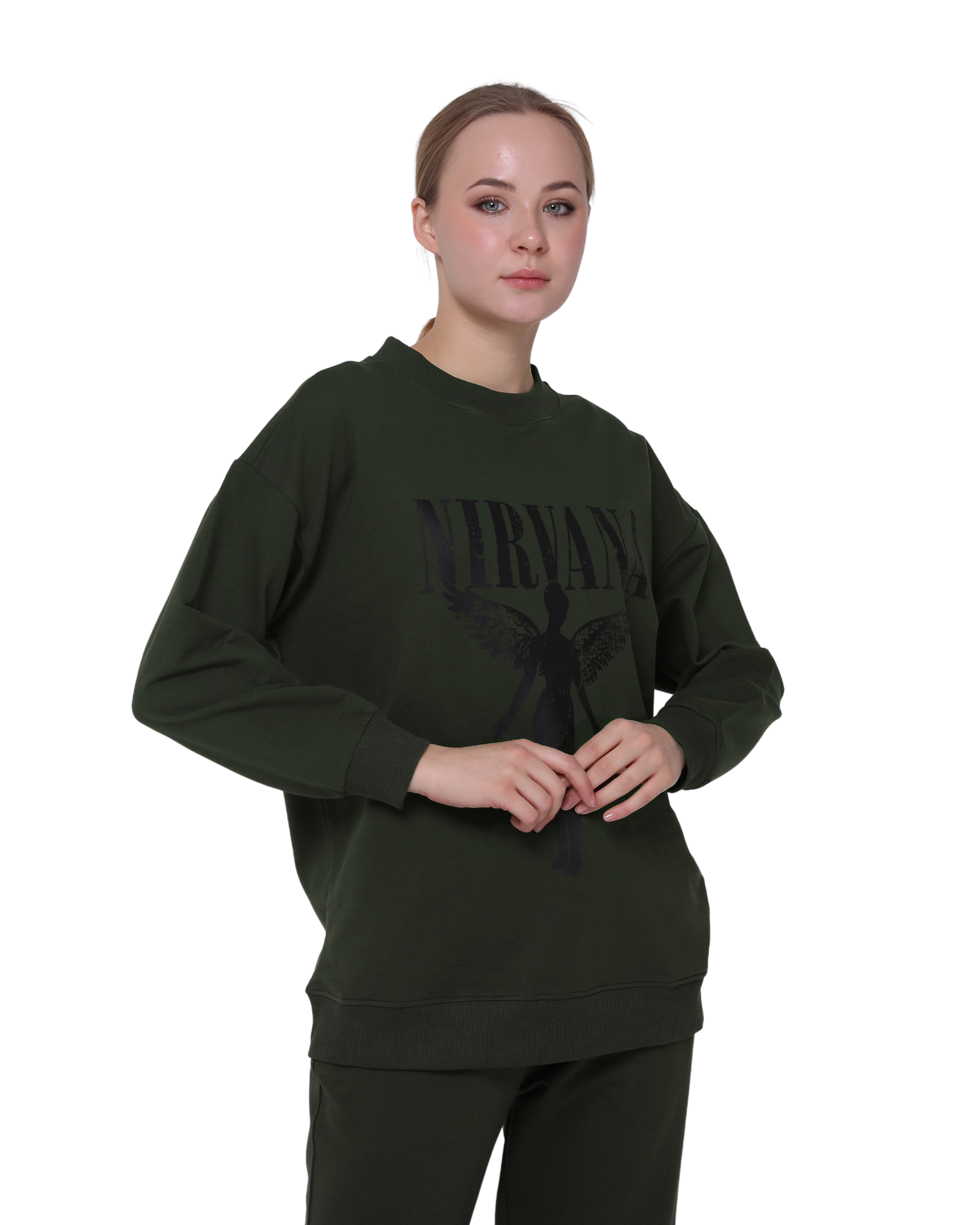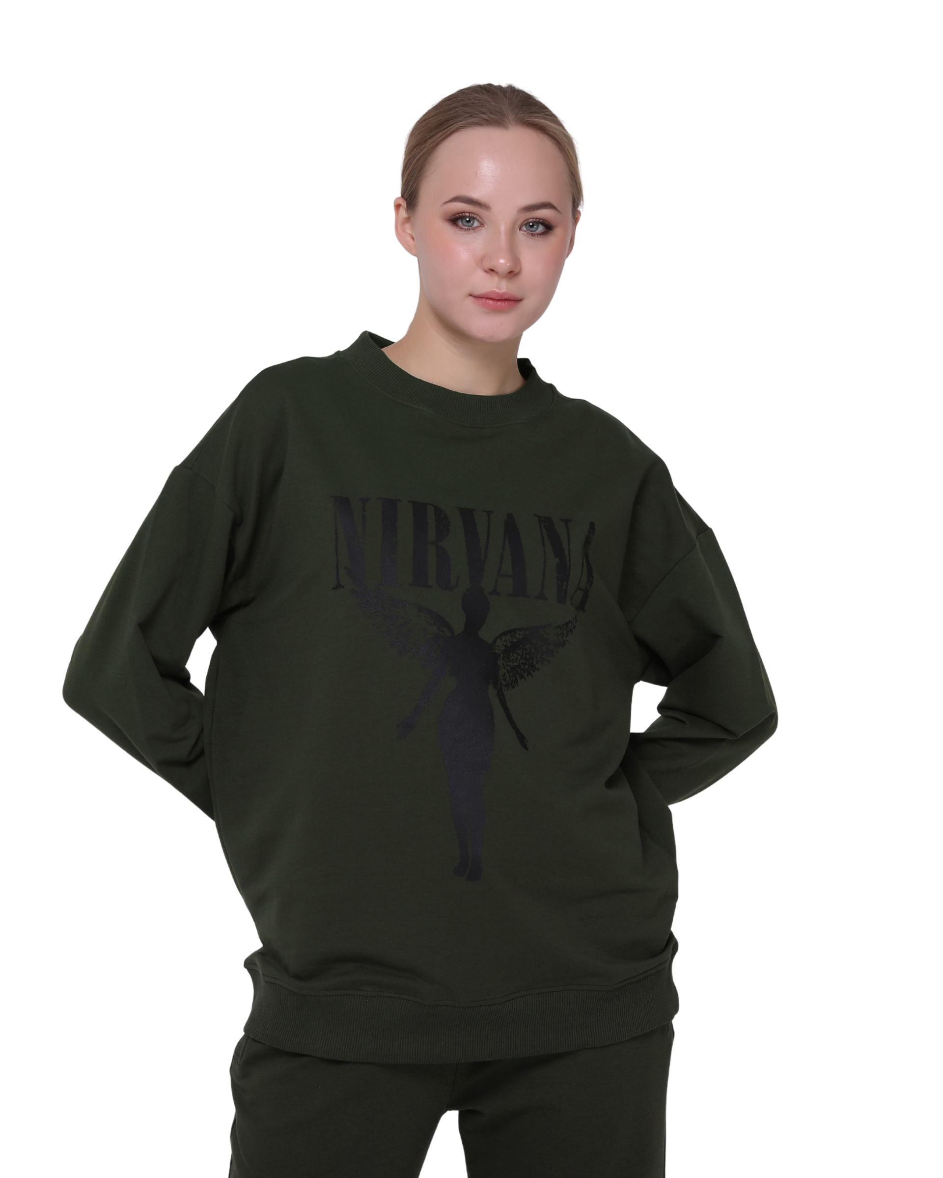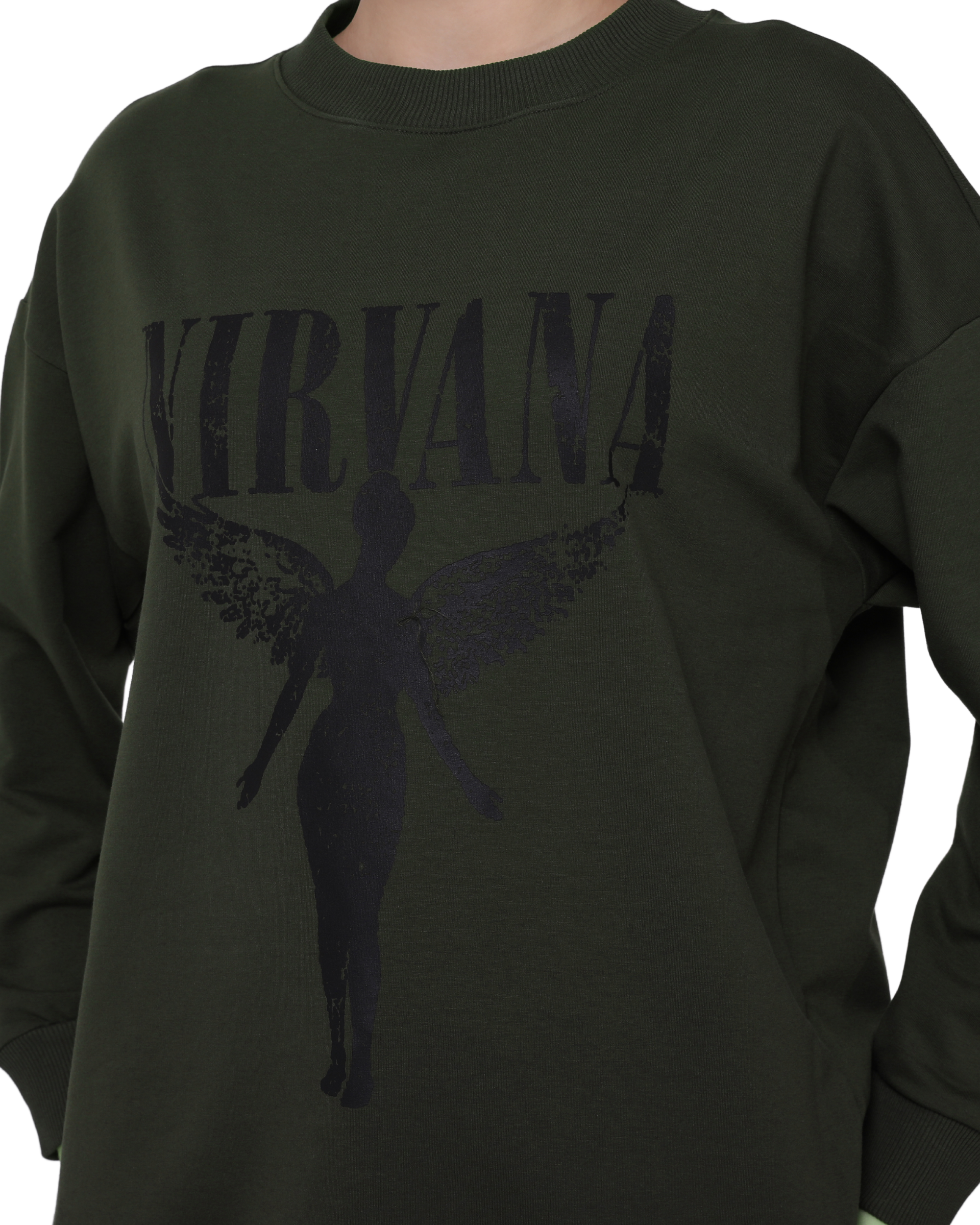 Nirvana Print Oversize Slim Fit Crew Neck Sweatshirt Khaki Green