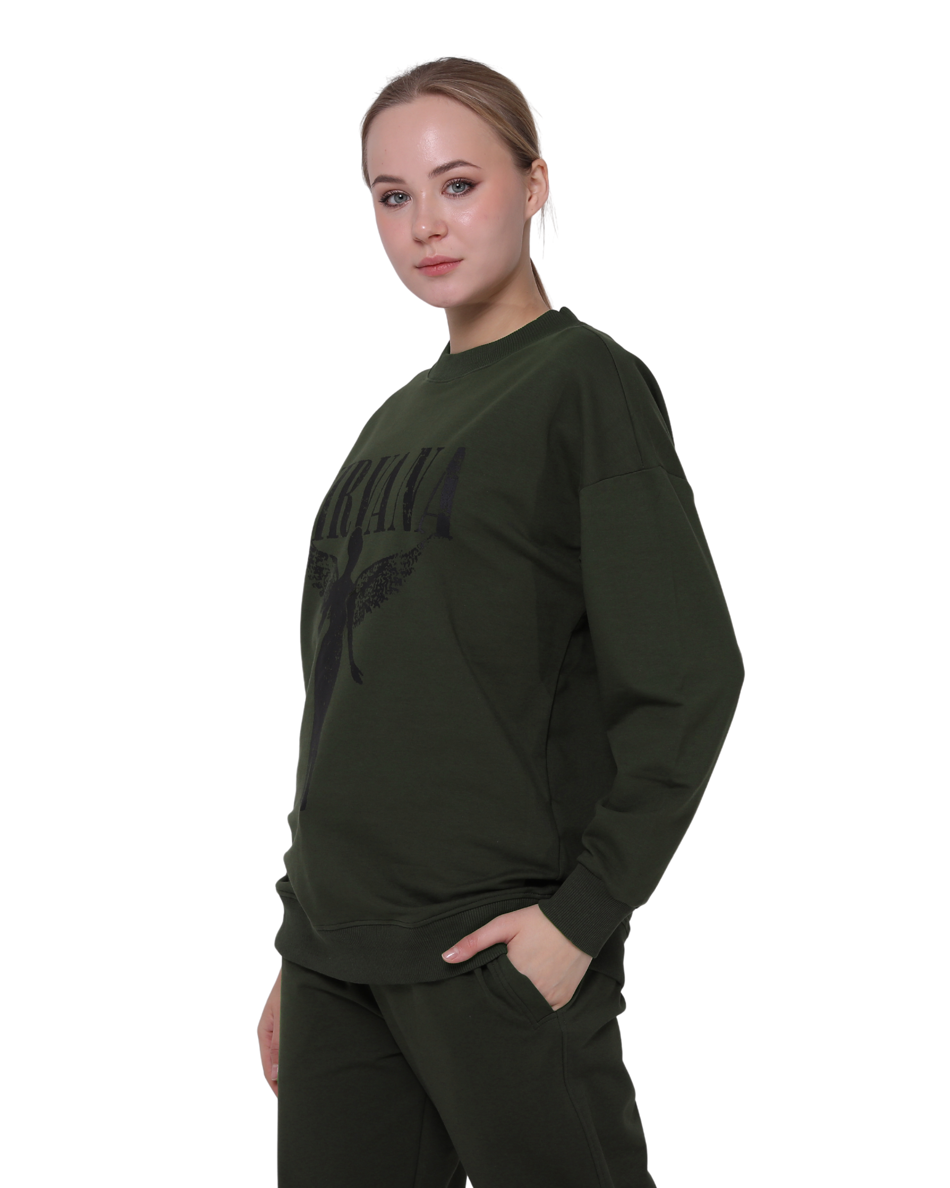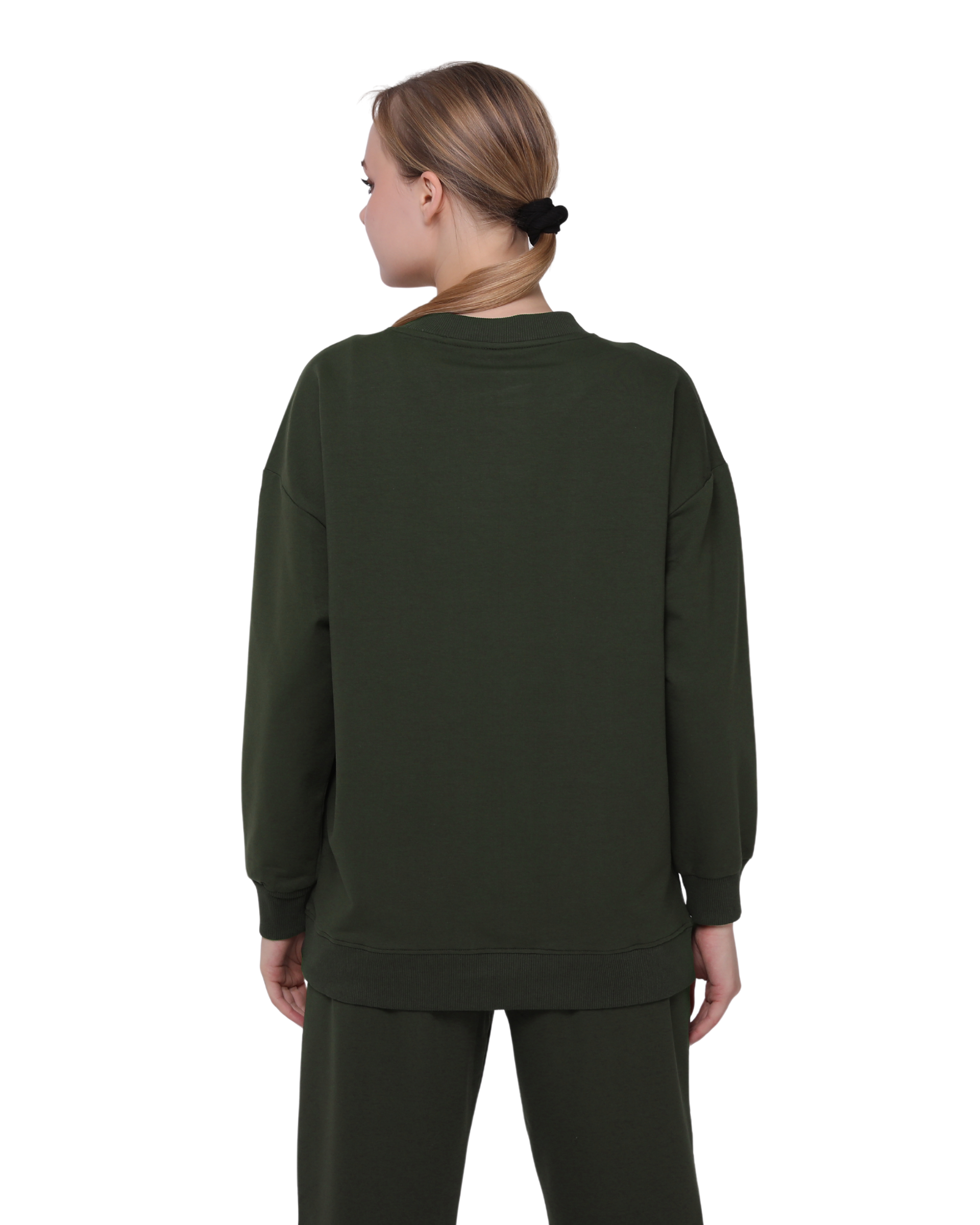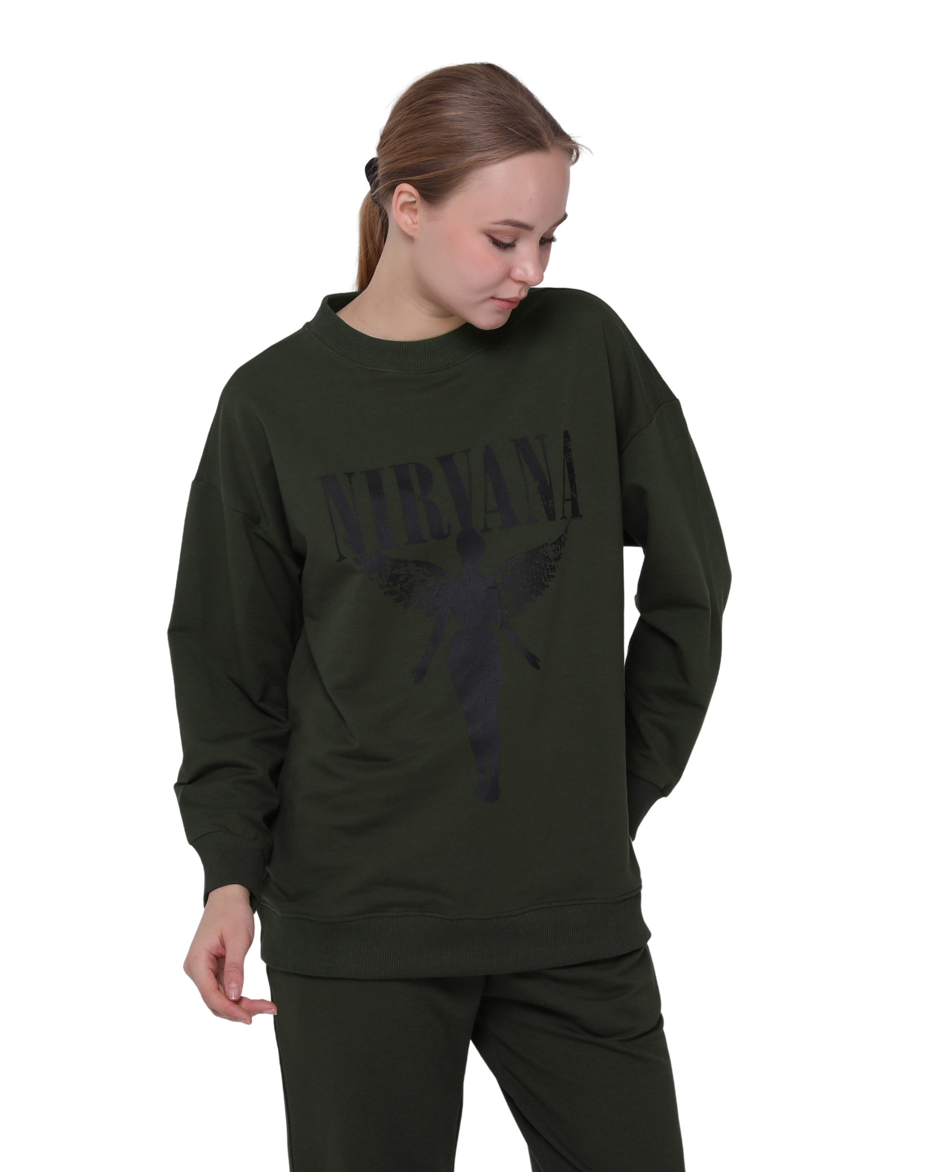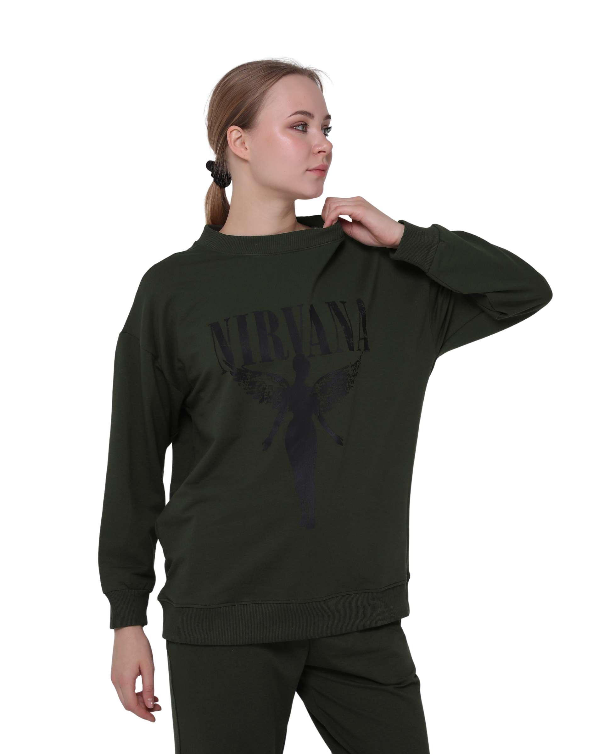 Nirvana Print Oversize Slim Fit Crew Neck Sweatshirt Khaki Green