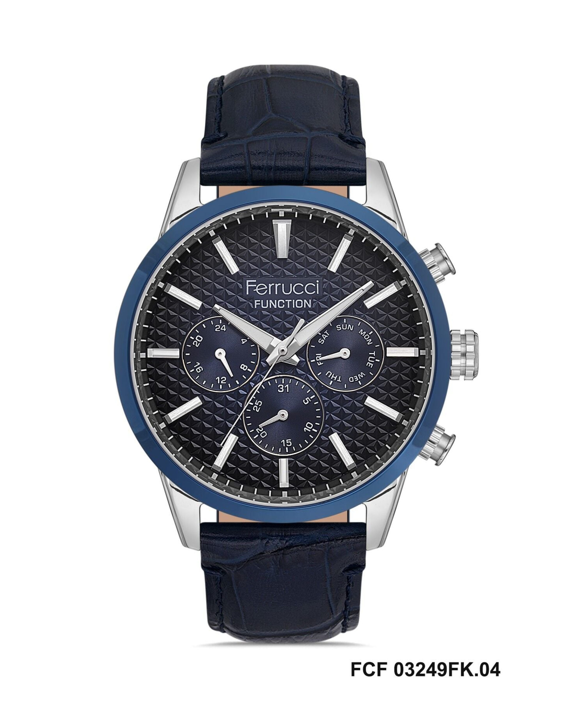 Ferrucci Silver Round Case Men's Watch | 45 mm Steel Case, Navy Blue Leather Strap, Black Dial