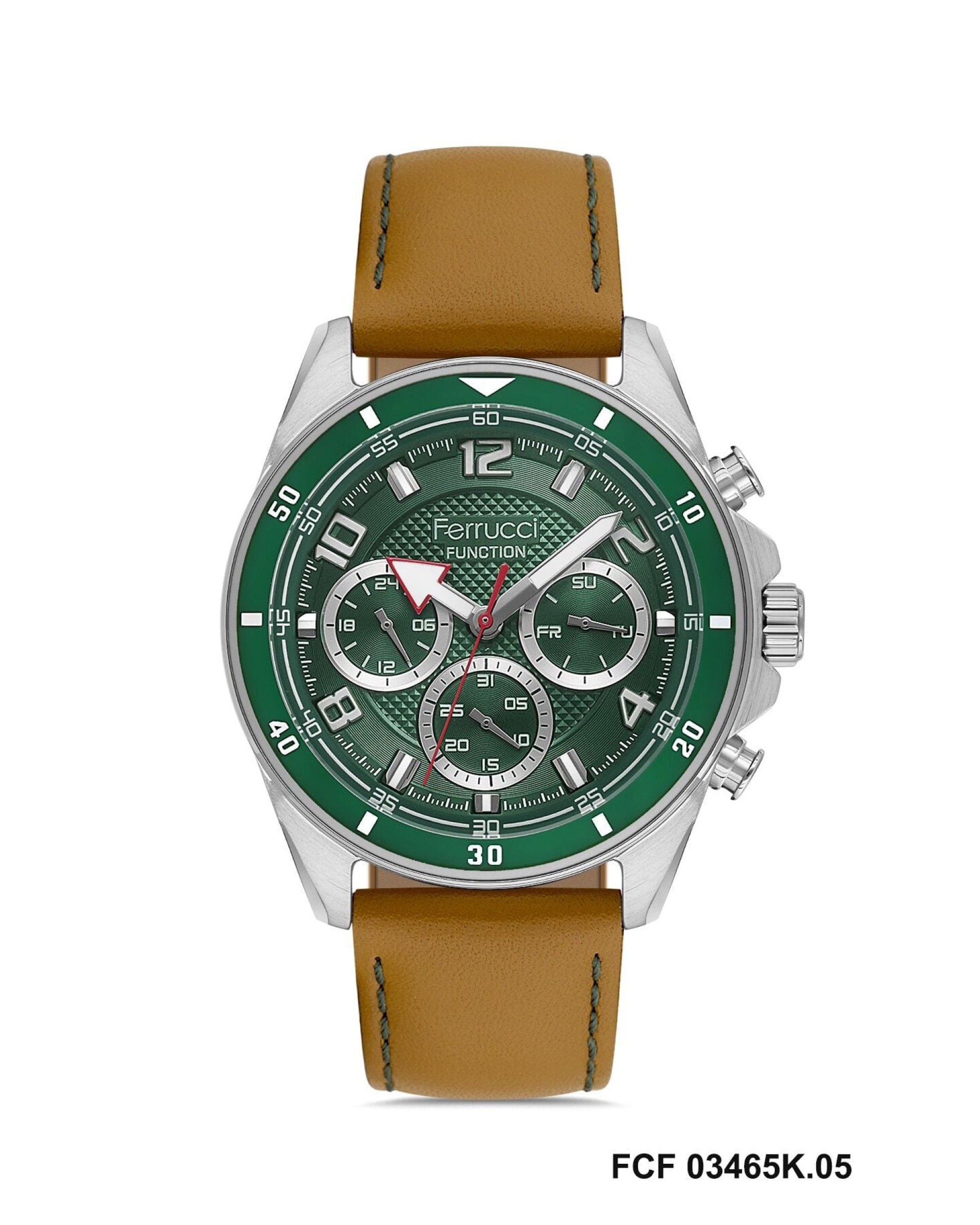Ferrucci Silver Round Case Men's Watch | 44 mm Steel Case, Light Brown Leather Strap, Green Dial