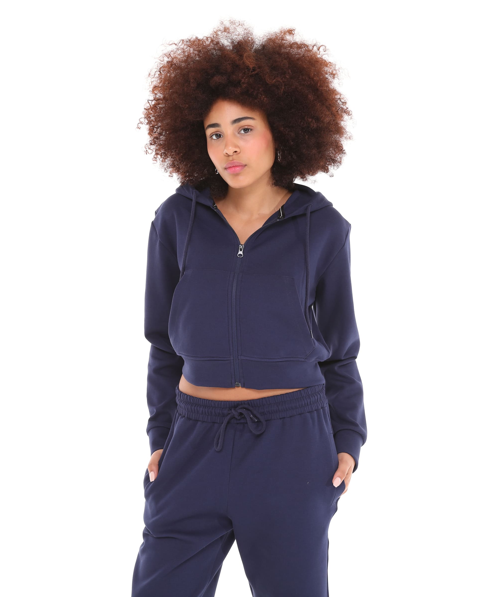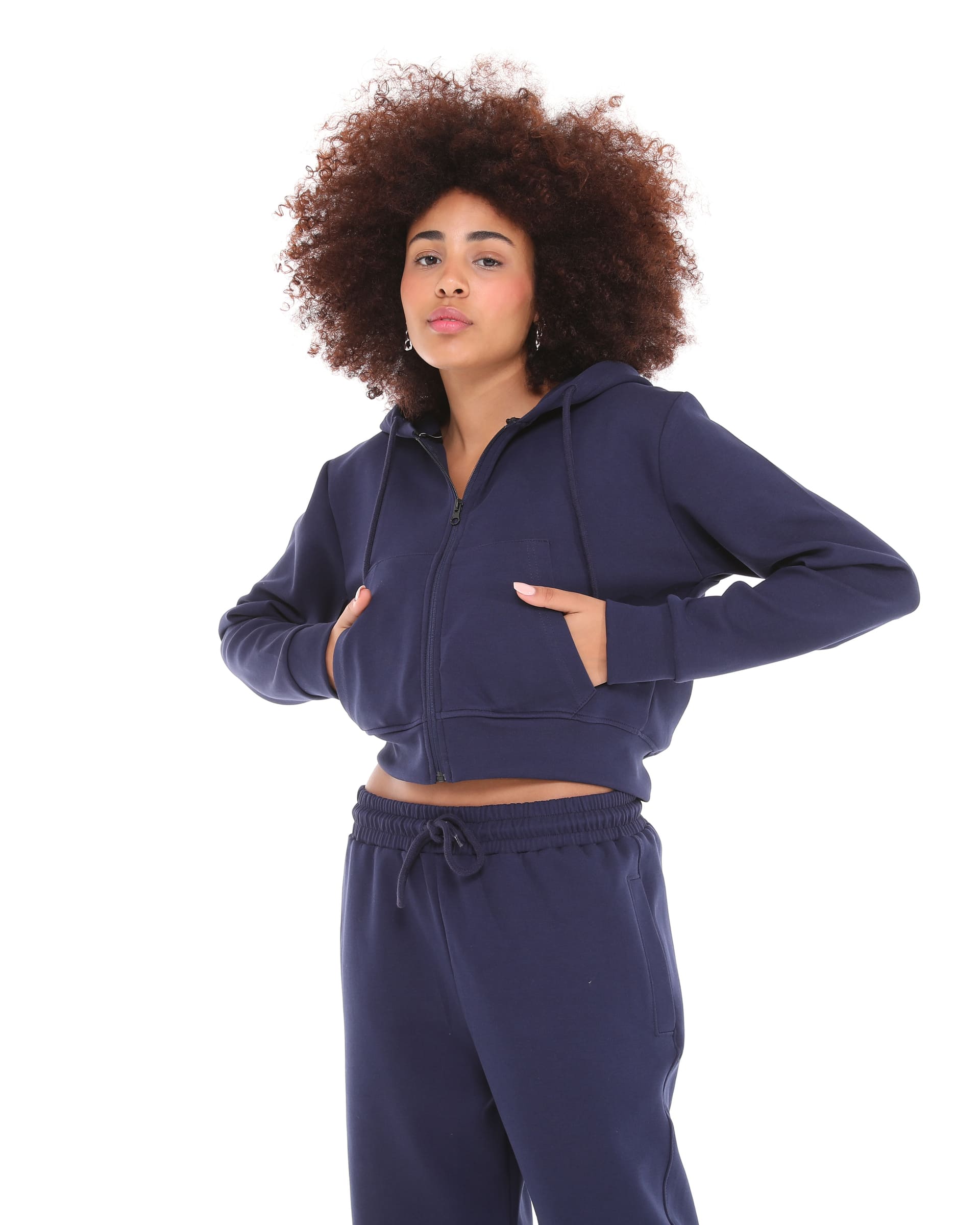 Navy Blue Hooded Crop Style Sweatshirt with Zipper