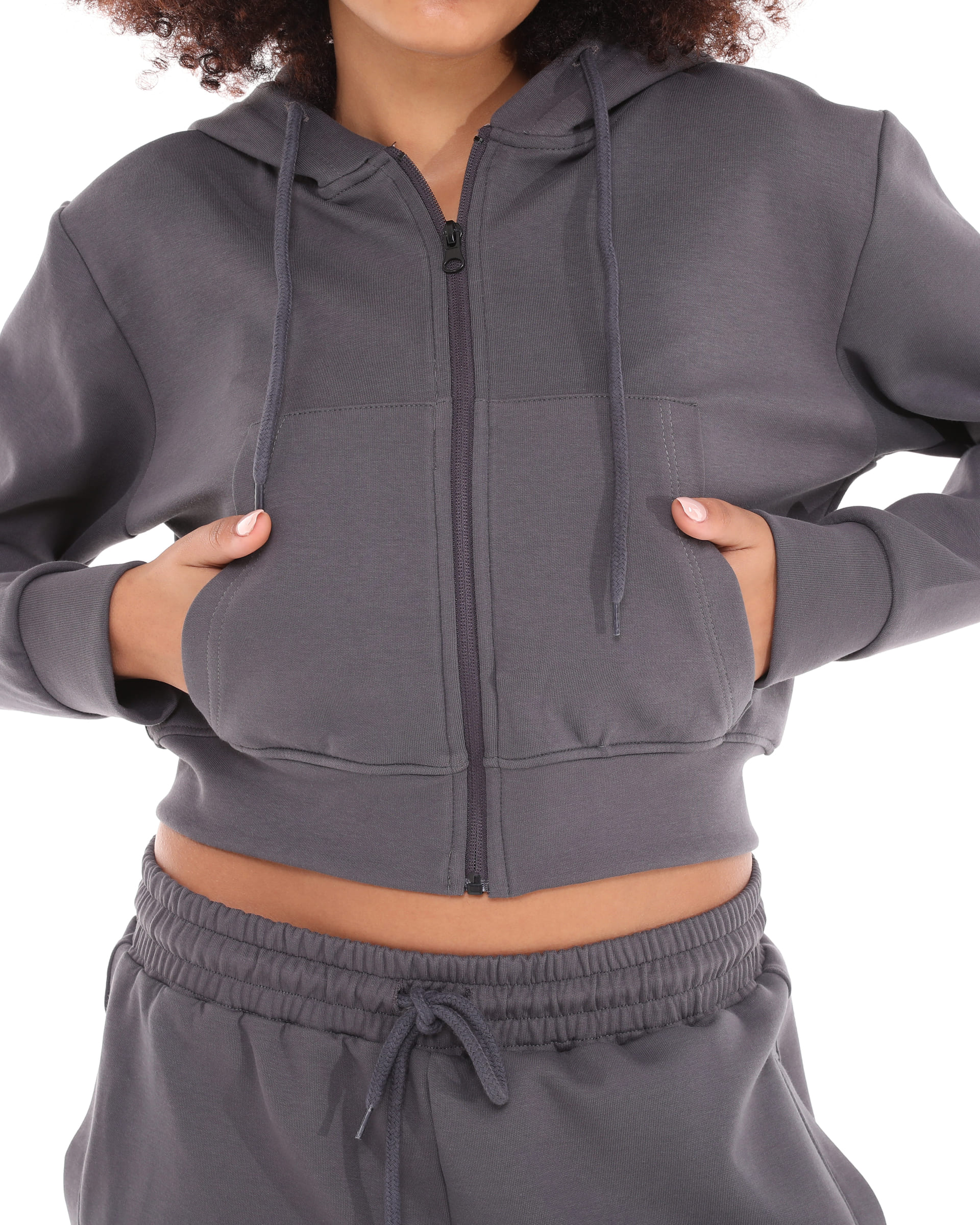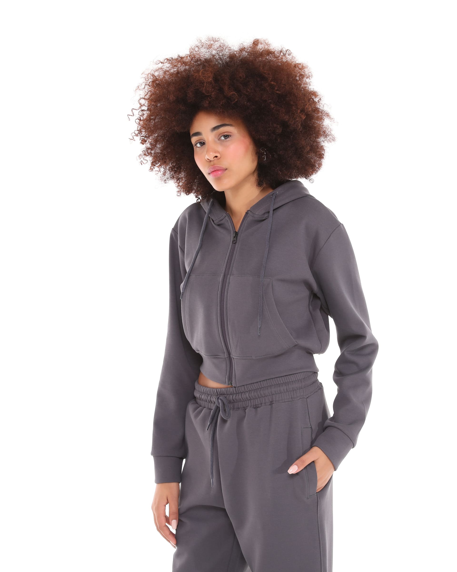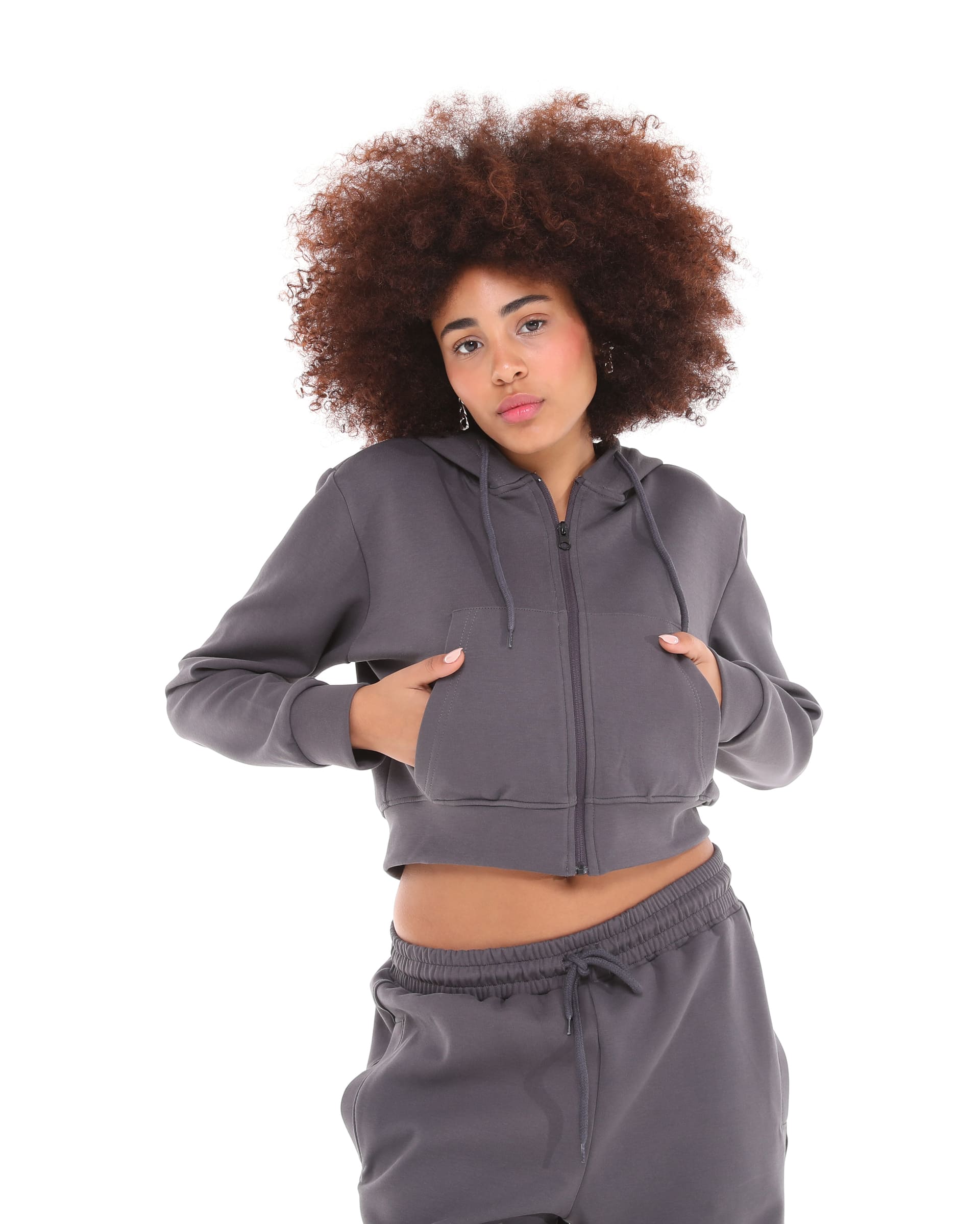 Hooded Crop Style Sweatshirt with Zipper Closure (Smoky Gray)