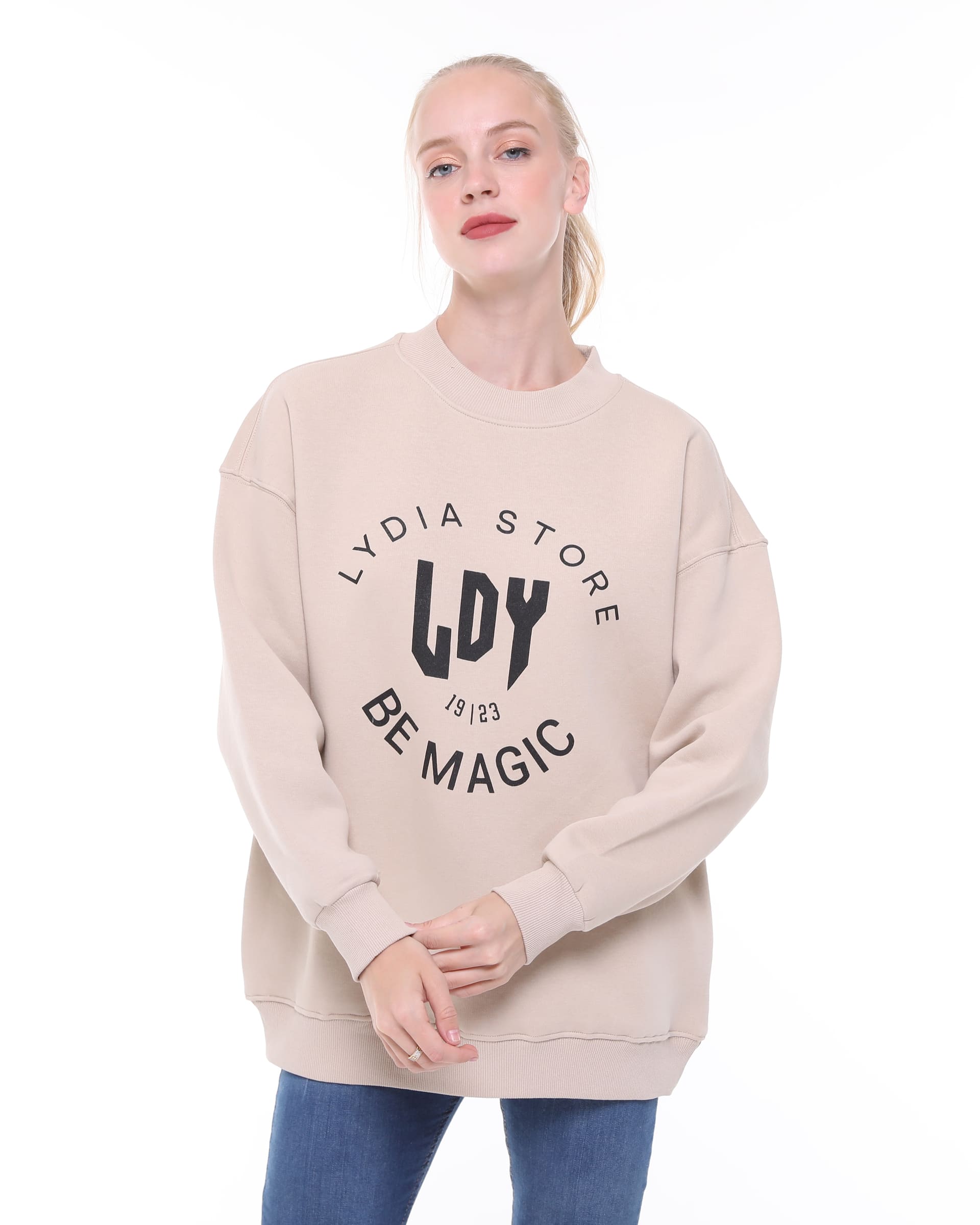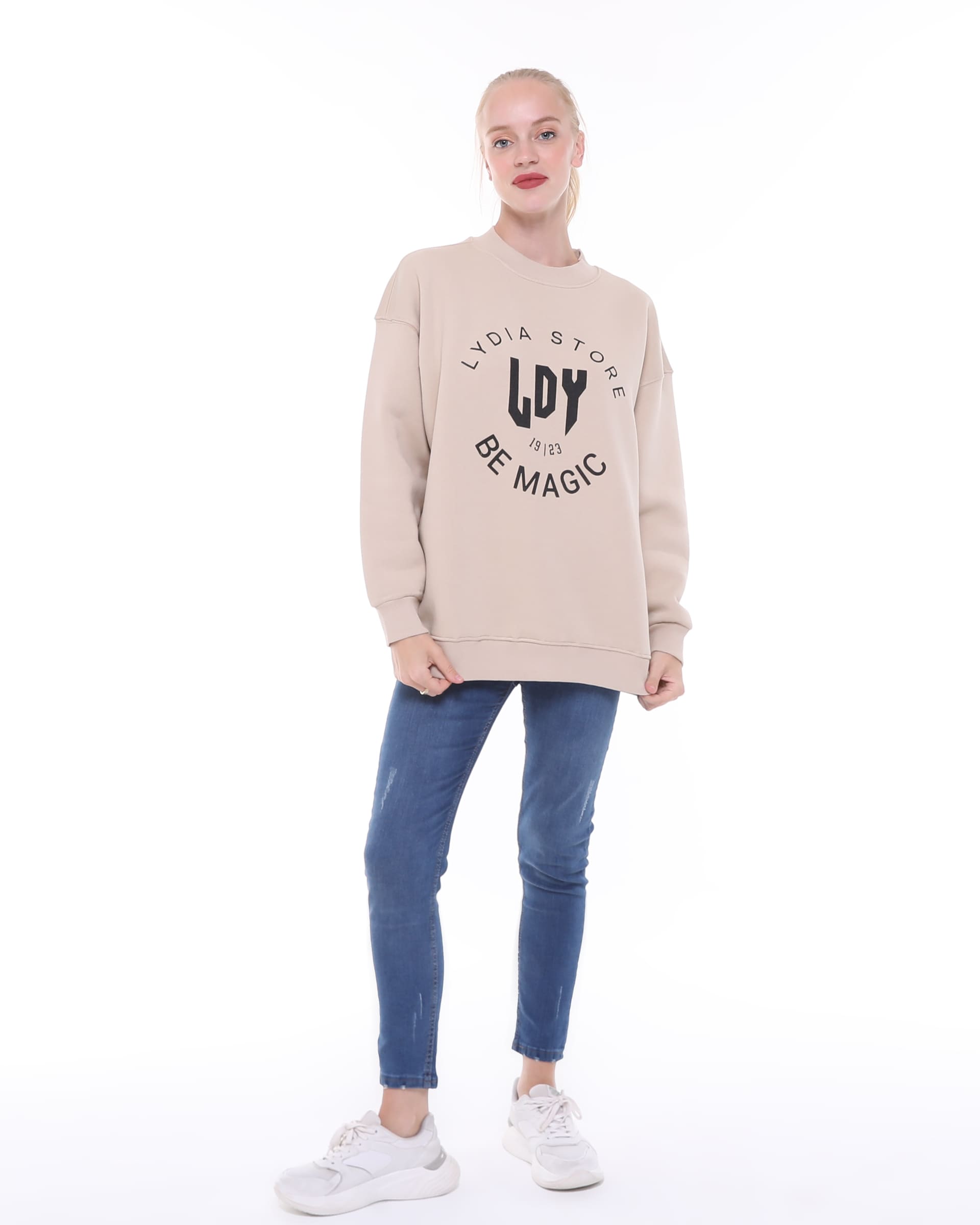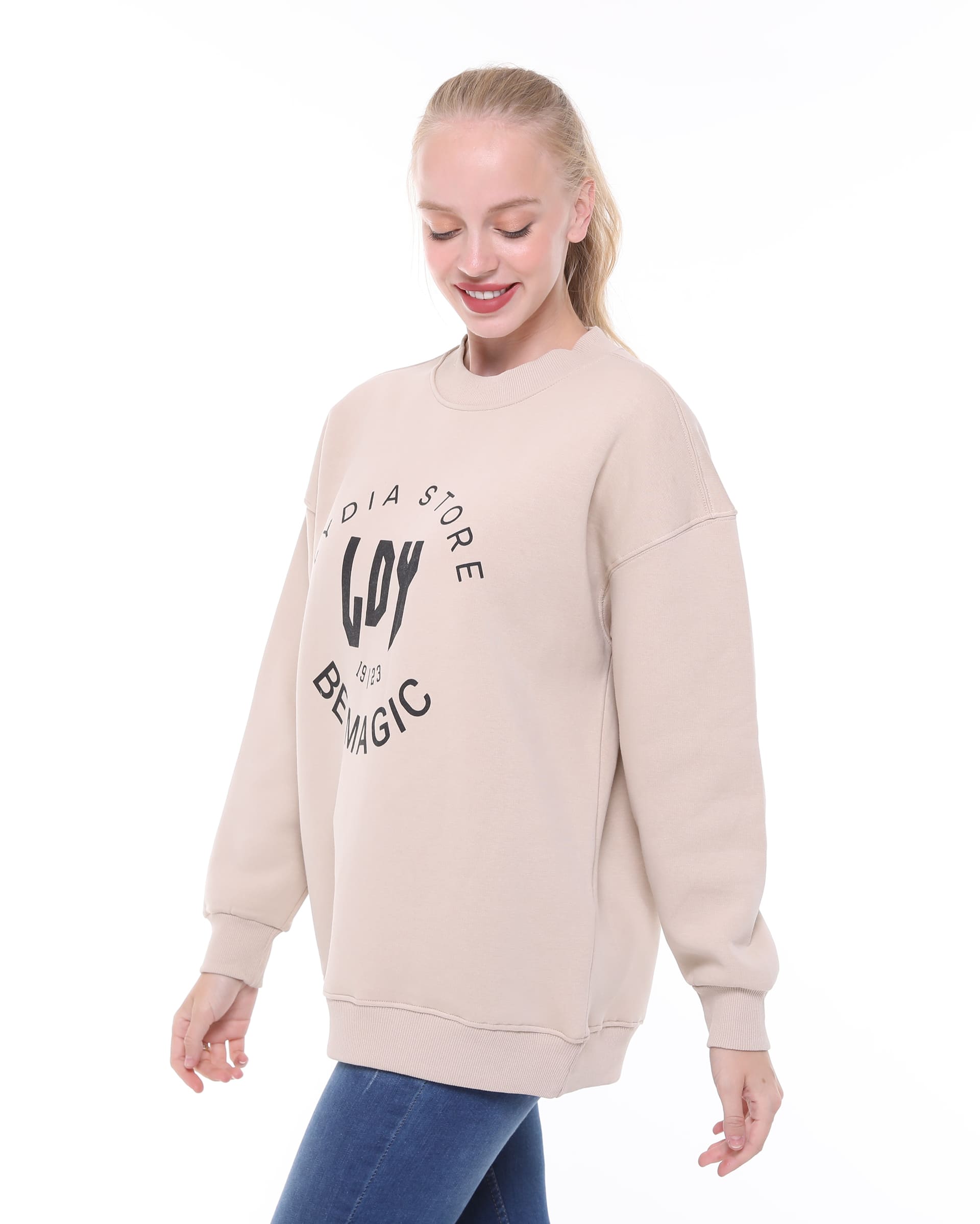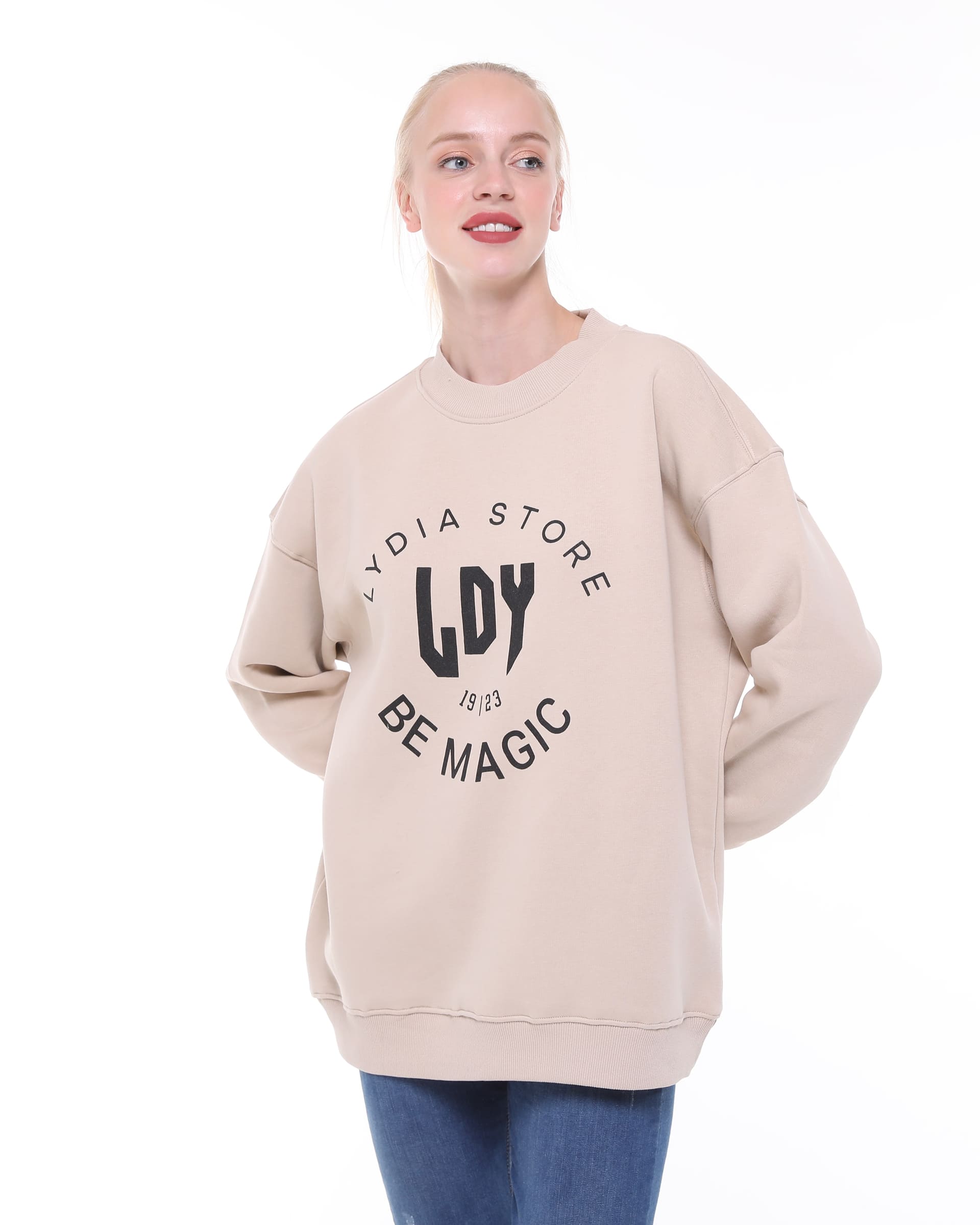 Marka Best Detailed Loose Crew Neck Beige Sweatshirt
