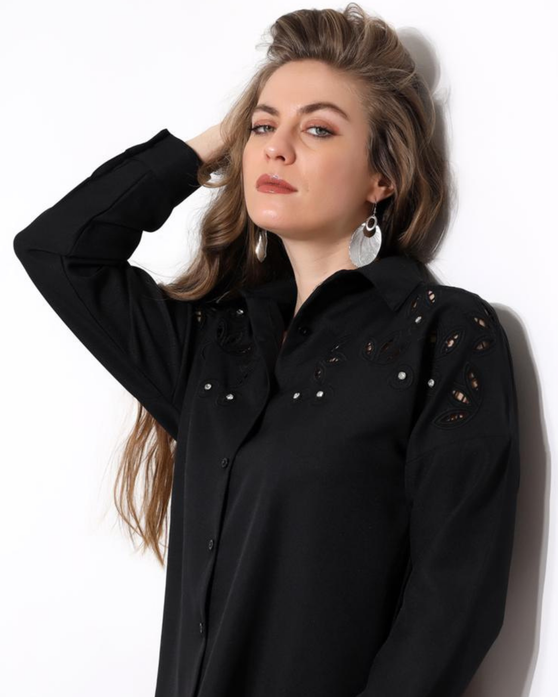 Marka Best Stone Embellished Basic Linen Shirt Black