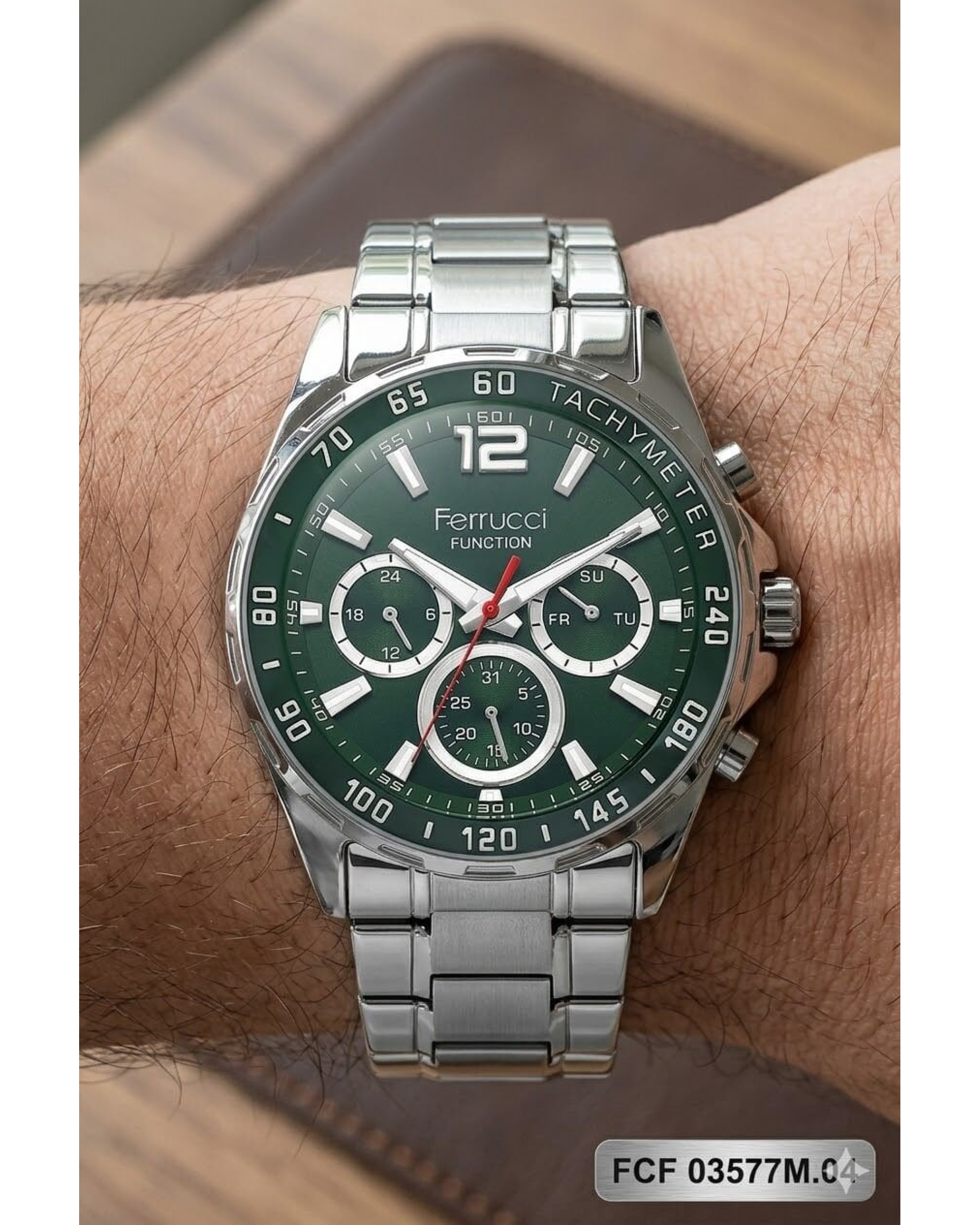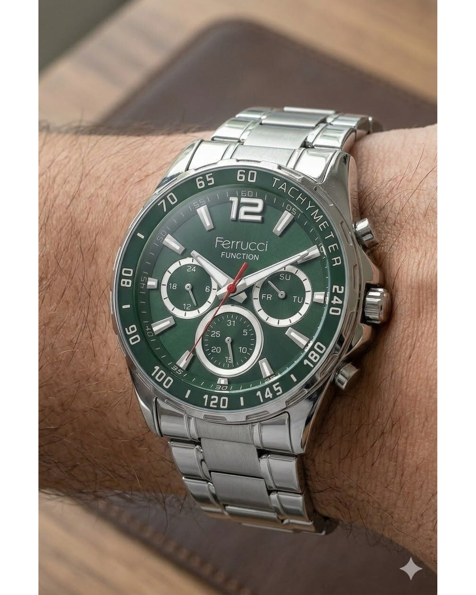 The Ferrucci men's wristwatch offers a striking look with its round case shape, strong bezel structure, and green dial design. The multi-functional details on the dial give the model a sporty and distinctive style, while the harmony with the silver case completes the watch's modern look. It has a stylish design that can be easily preferred for daily use and city style.